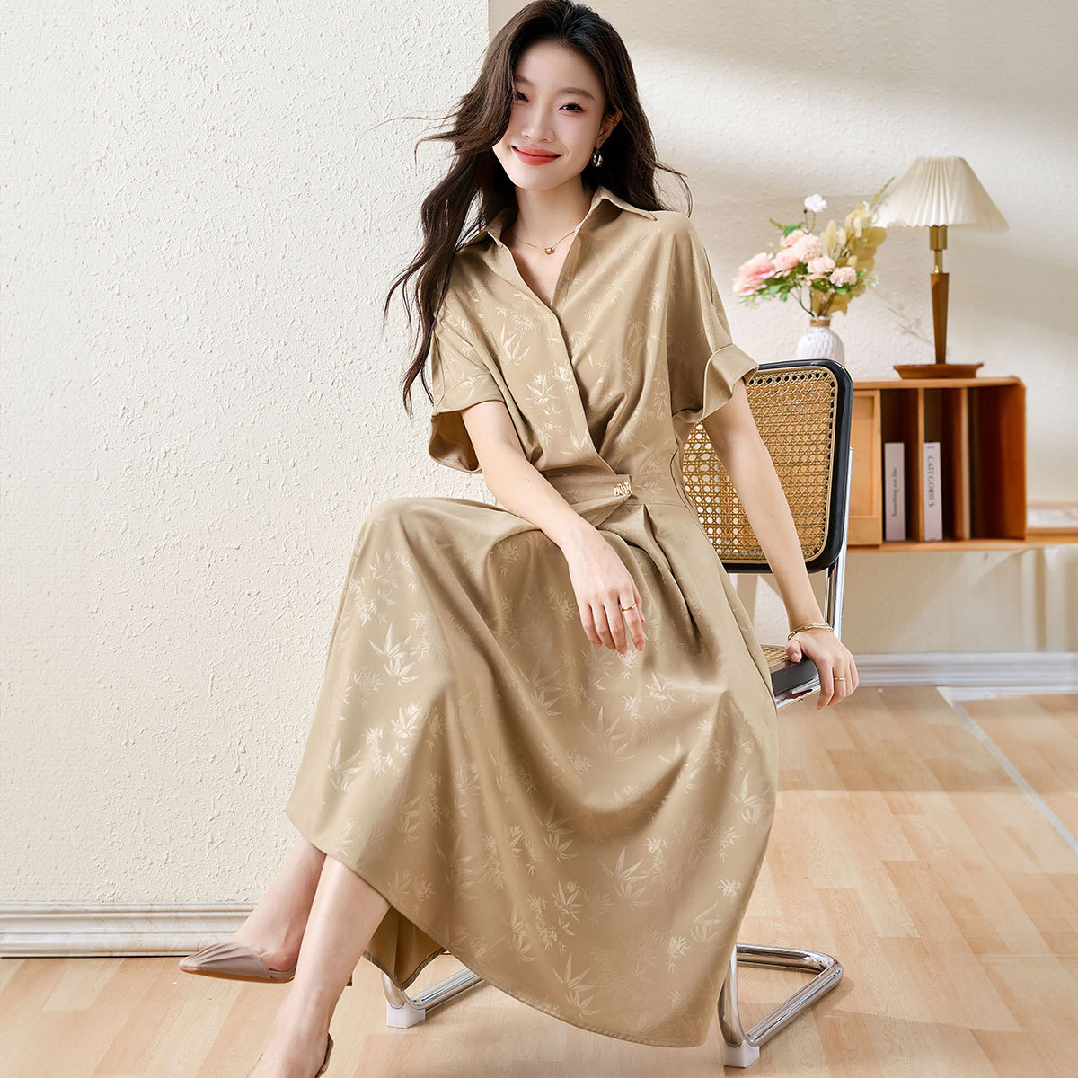 夏季短袖圆领桑蚕丝舒适A型裙含内搭两件套优雅气质连衣裙 192351