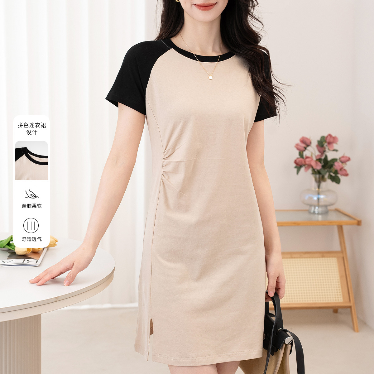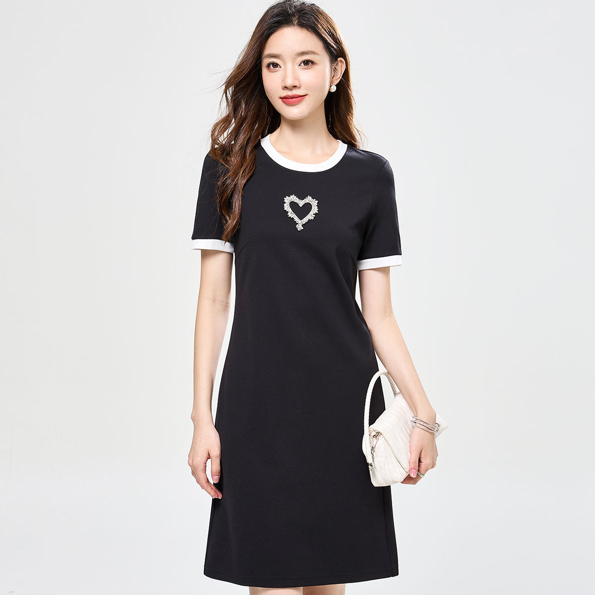 简约高级感黑白撞色圆领通勤连衣裙女遮肚显瘦优雅气质夏款裙子 699615