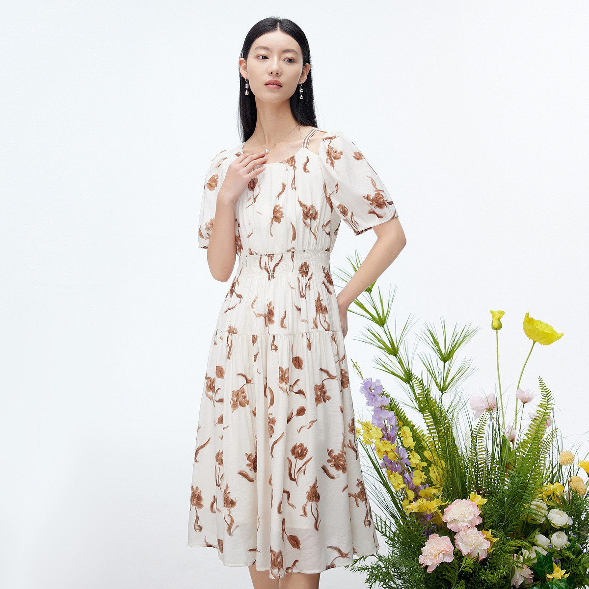 浪漫松紧腰泡泡袖印花连衣裙女夏季镂空设计感拼接收腰A字裙女 407555