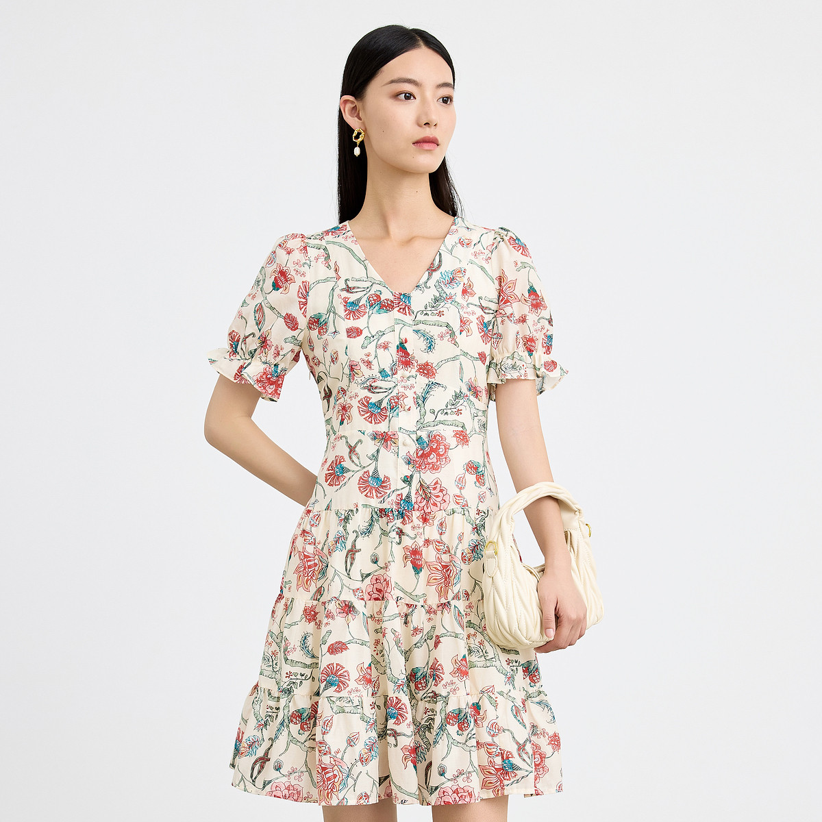 浪漫v领印花连衣裙女夏季小众设计感田园风裙子拼接收腰A字裙女 415747