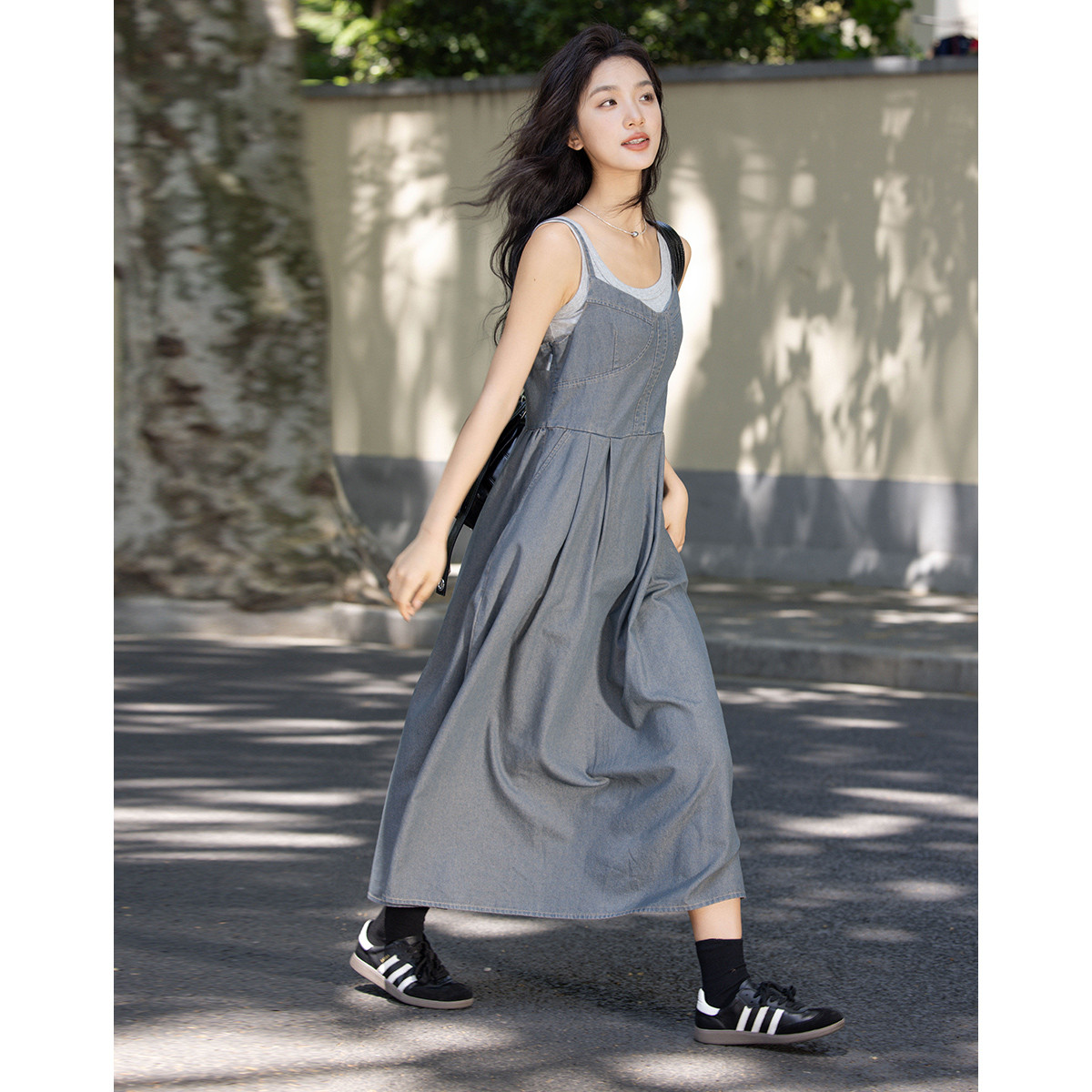 【复古灰调牛仔吊带裙】秋水洗高腰肩带可调节长款连衣裙 338690