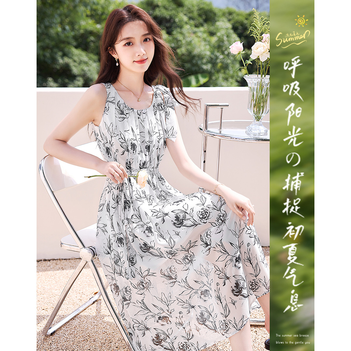 【轻奢度假】夏圆领桑蚕丝调节腰无袖抽绳印花复古连衣裙 620097