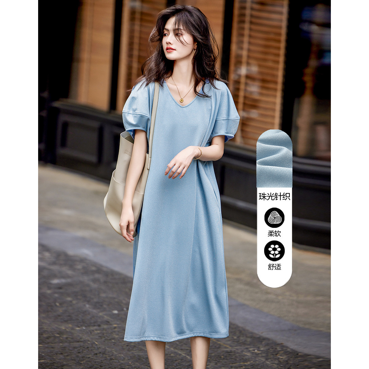 【闪粉珠光针织】夏简约风V领显瘦藏肉短袖休闲气质连衣裙 865089
