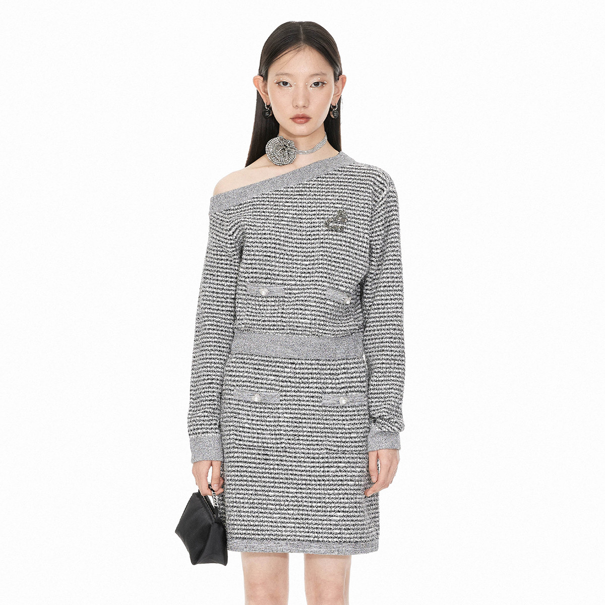 地素针织斜肩连衣裙春季小香风爱心钻饰短裙女 190411
