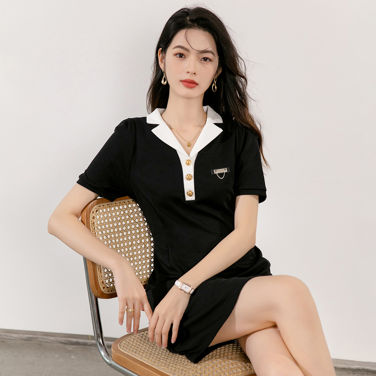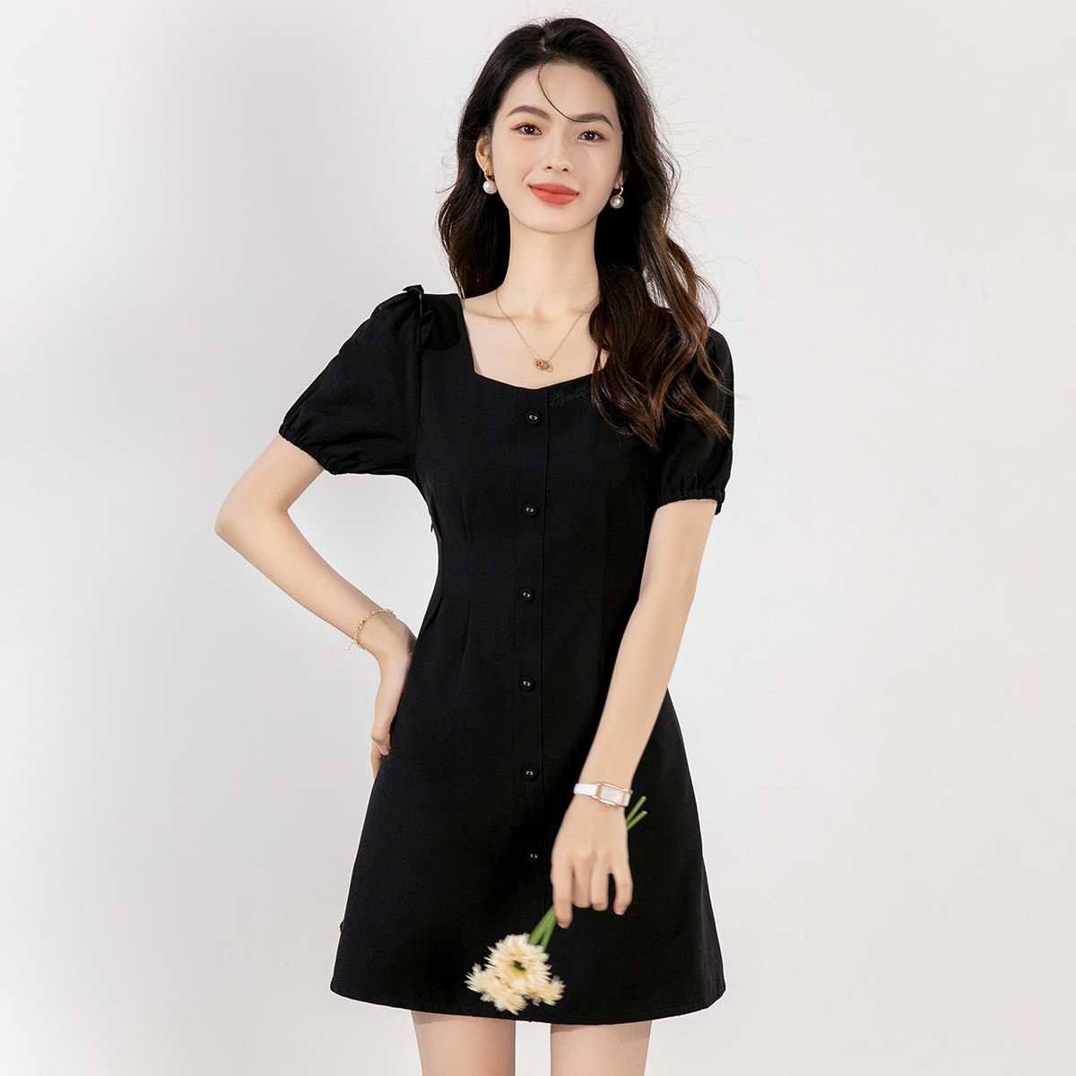 【泡泡袖小黑裙】年夏季减龄短袖纯色设计显瘦短袖连衣裙 466776