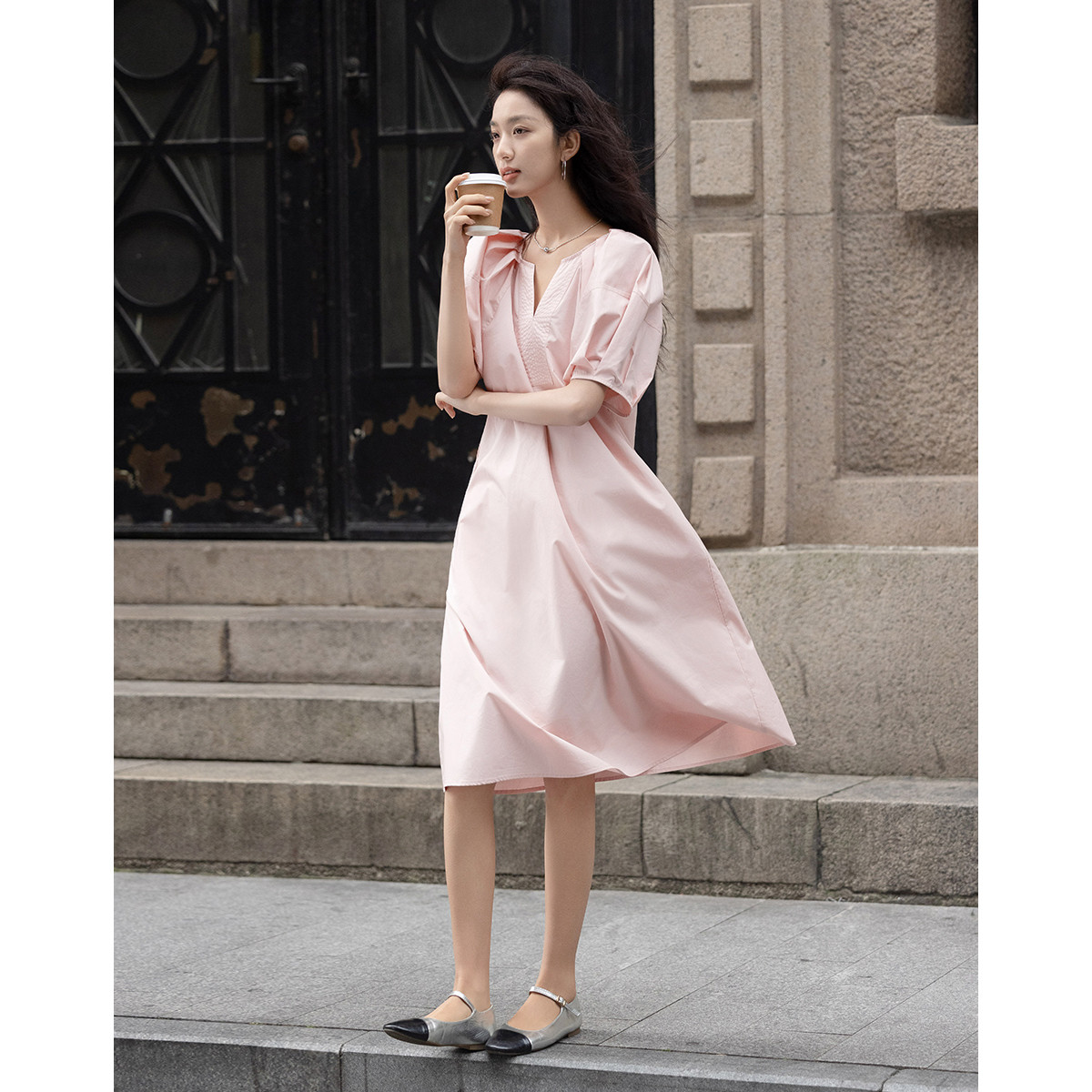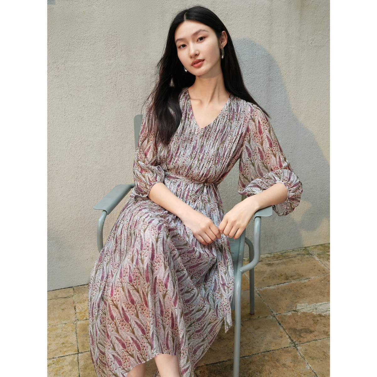 旗下安娜蔻系列优雅复古肌理感灵动垂坠桑蚕丝混纺连衣裙女 019468