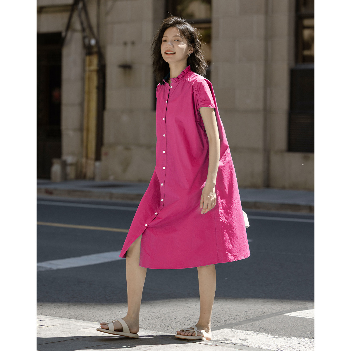 【多巴胺玫红衬衫裙】夏肩部抽褶设计长短袖中长款连衣裙 149378