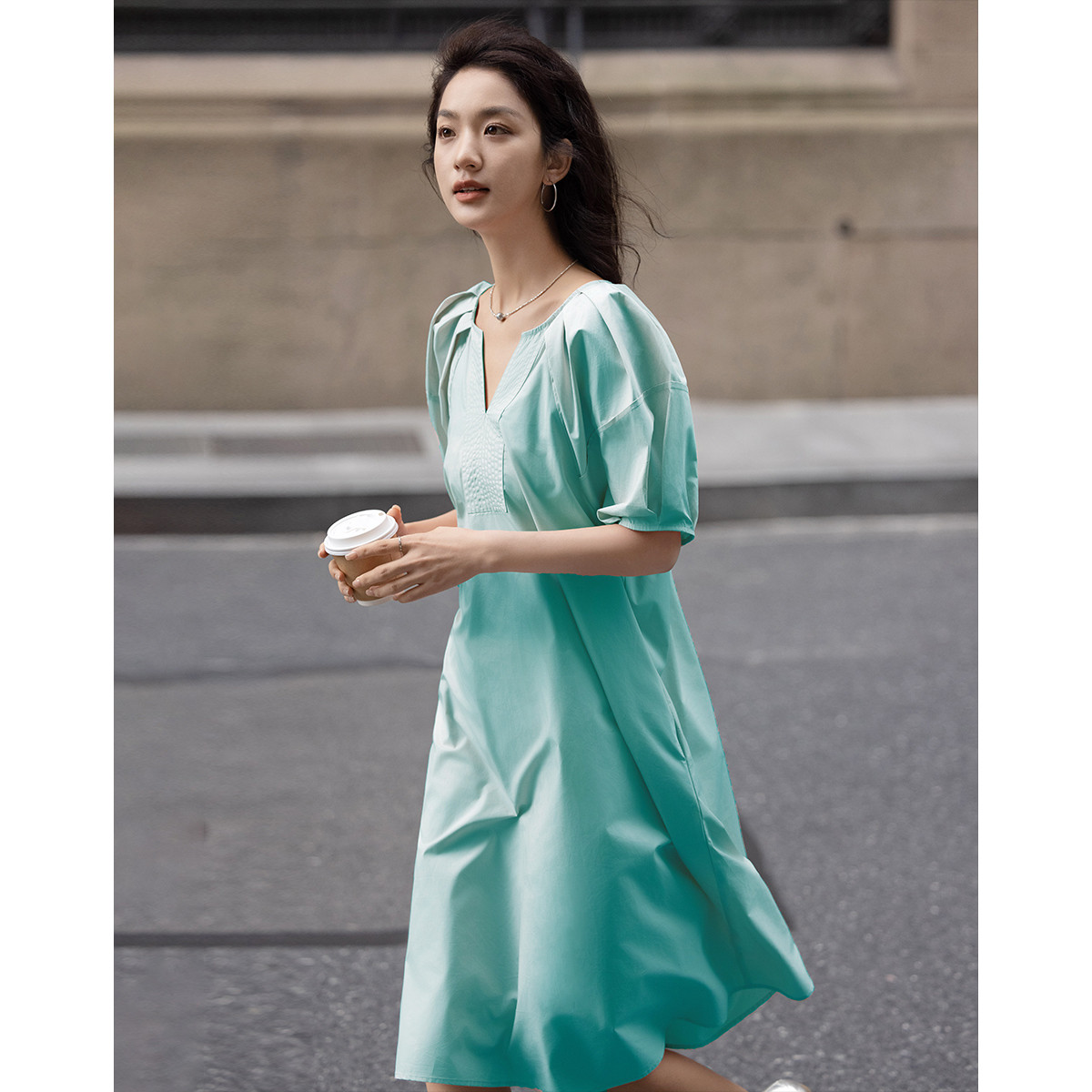 【薄荷曼波色随性连衣裙】夏南法庄园V领插肩中长款连衣裙 730818