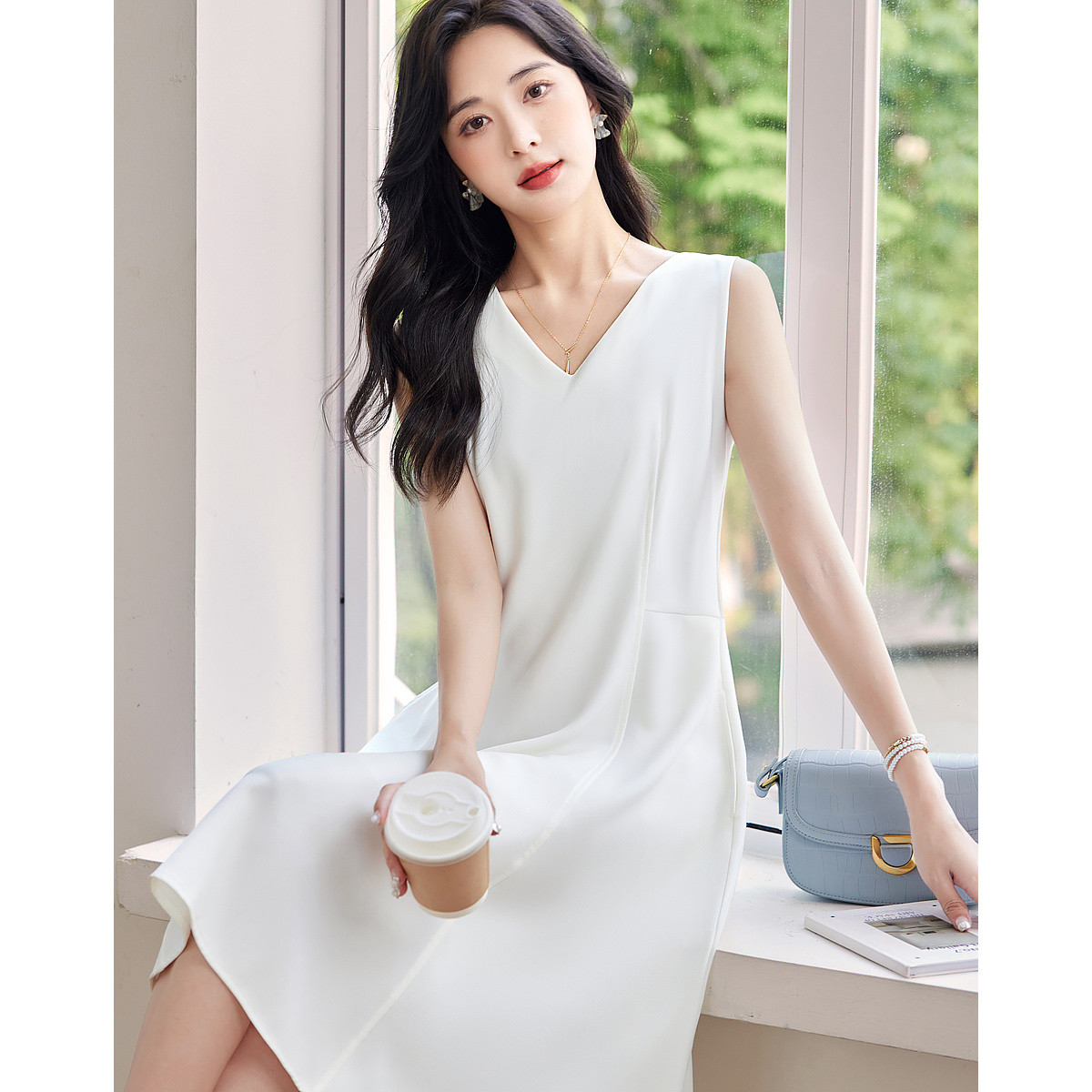 【清冷小白花】夏气质女神V领收腰小白裙无袖显瘦背心连衣裙女 559361