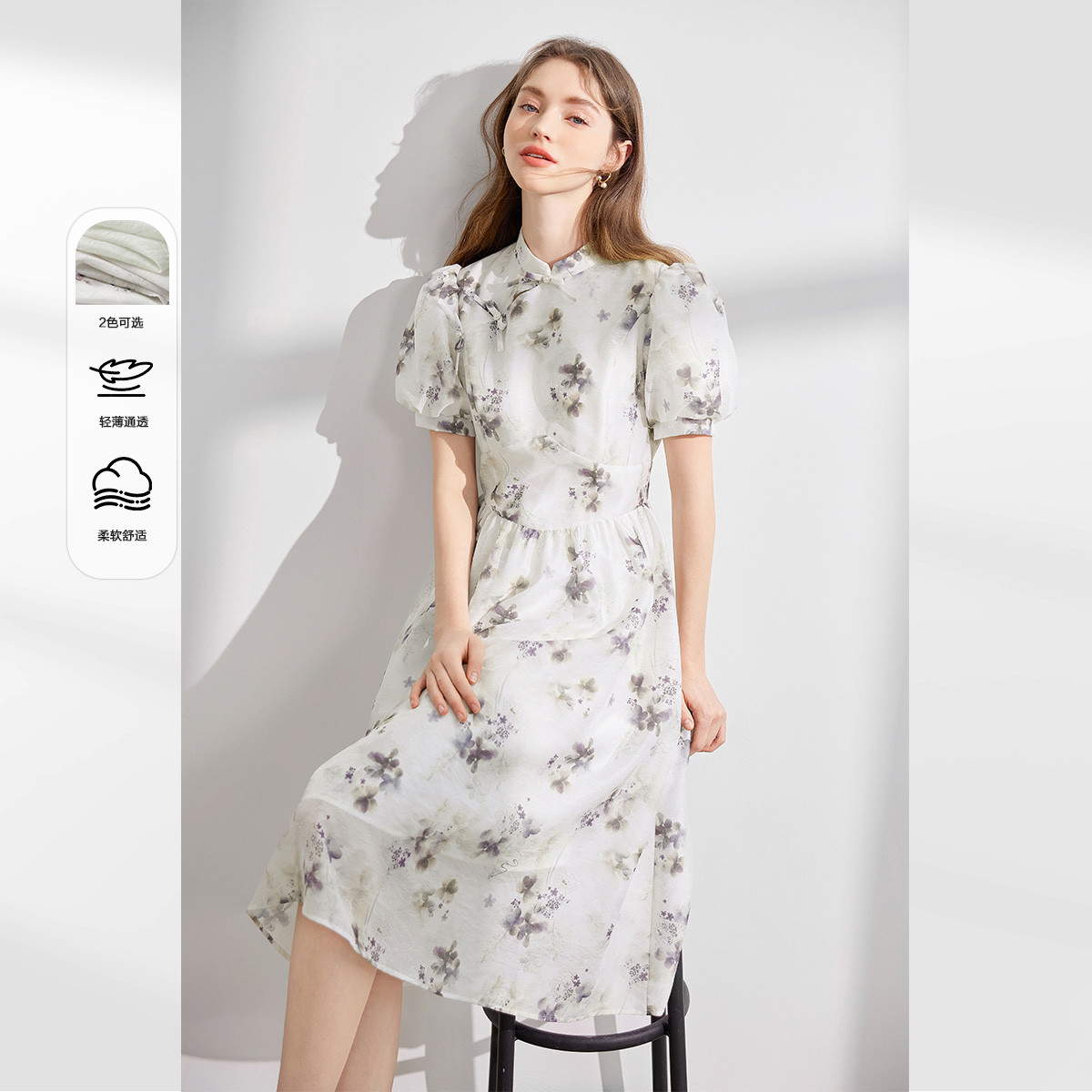 旗下安娜蔻系列浪漫度假风雪纺水彩印花泡泡袖连衣裙女秋季 515788