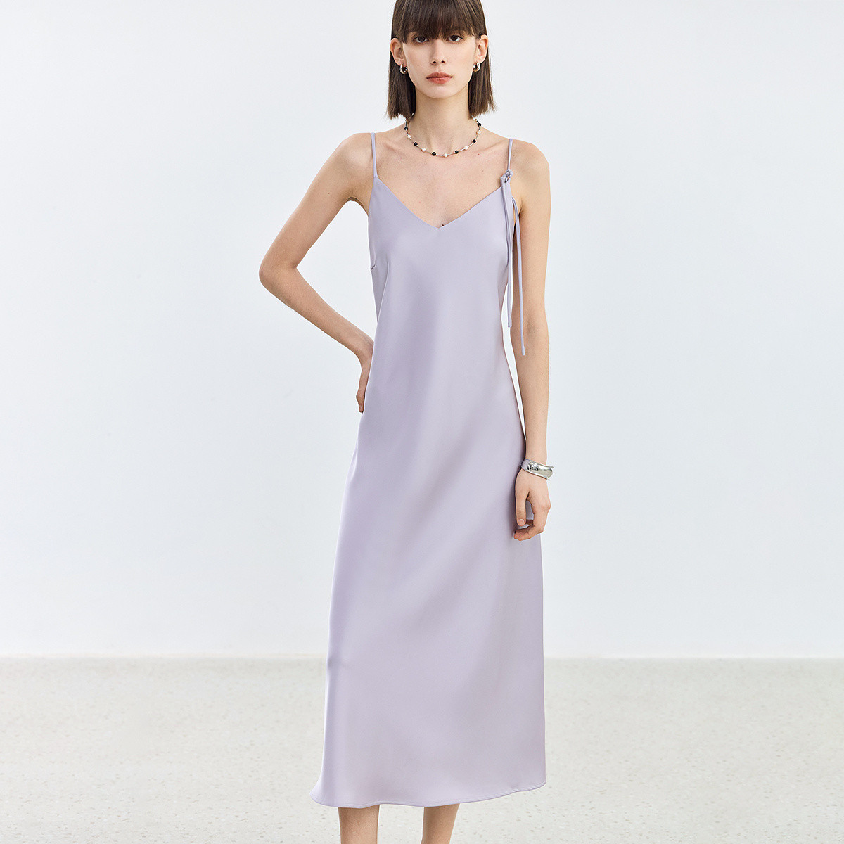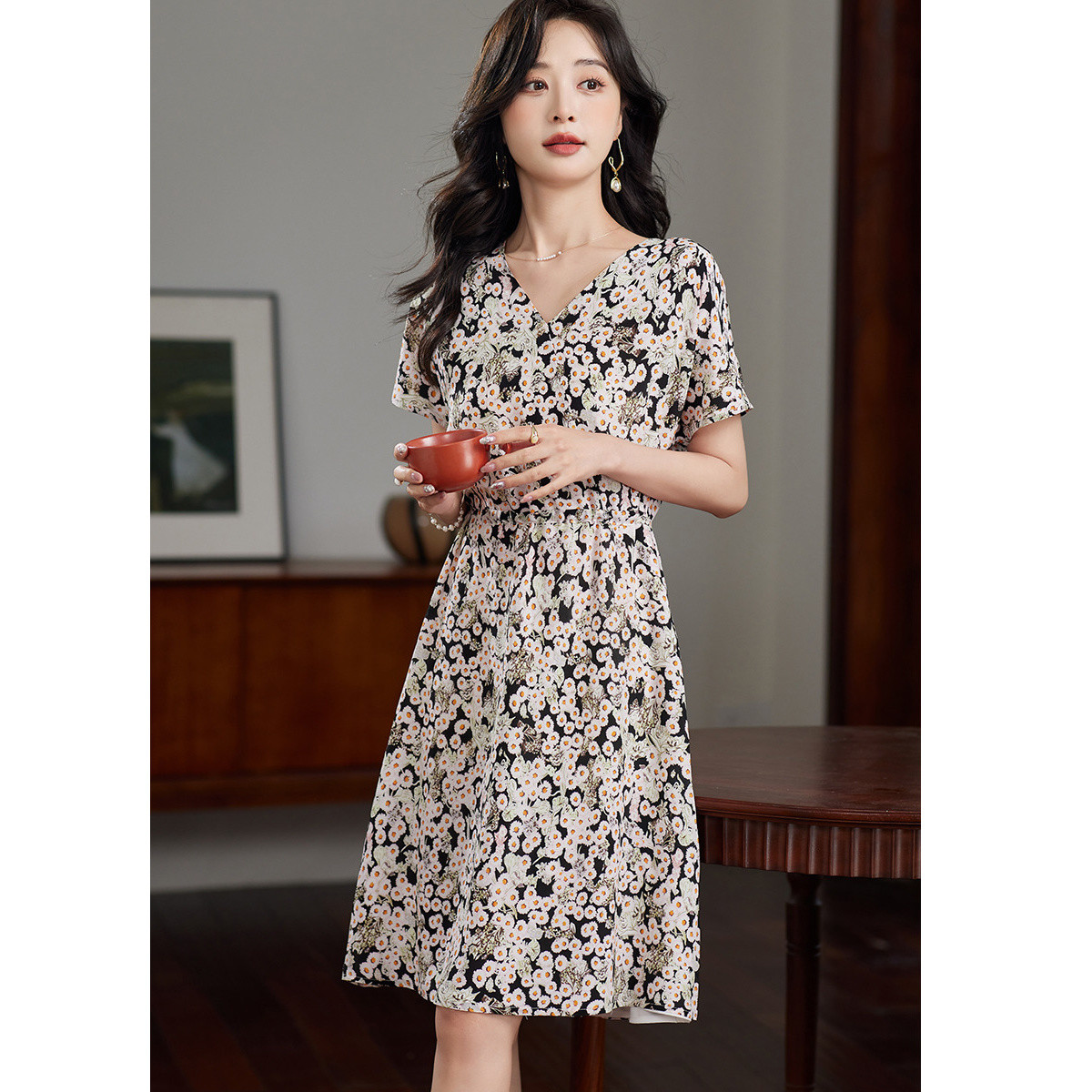 【淑女慵懒OOTD】夏V领柔润真丝桑蚕丝舒适藏肉连衣裙 443201