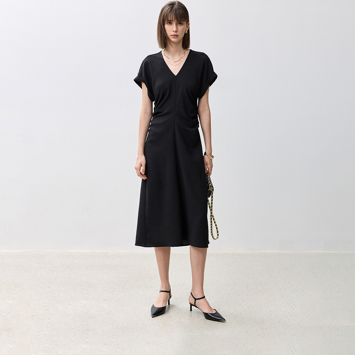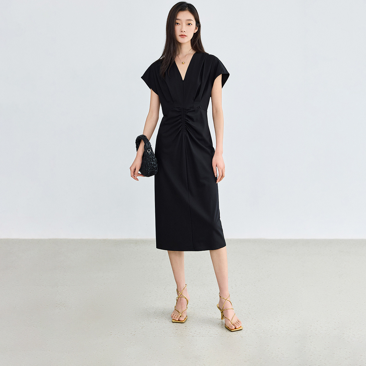 夏季优雅都市通勤气质V领立体收腰显瘦黑色连衣裙女 686363
