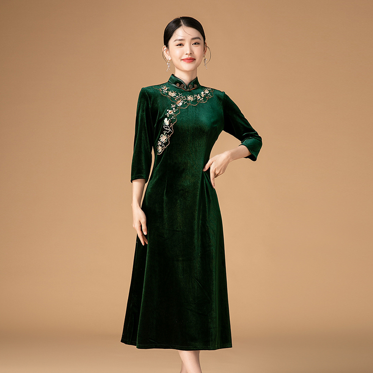 金丝绒中式旗袍改良国风婚宴喜庆过年礼服刺绣连衣裙 434911