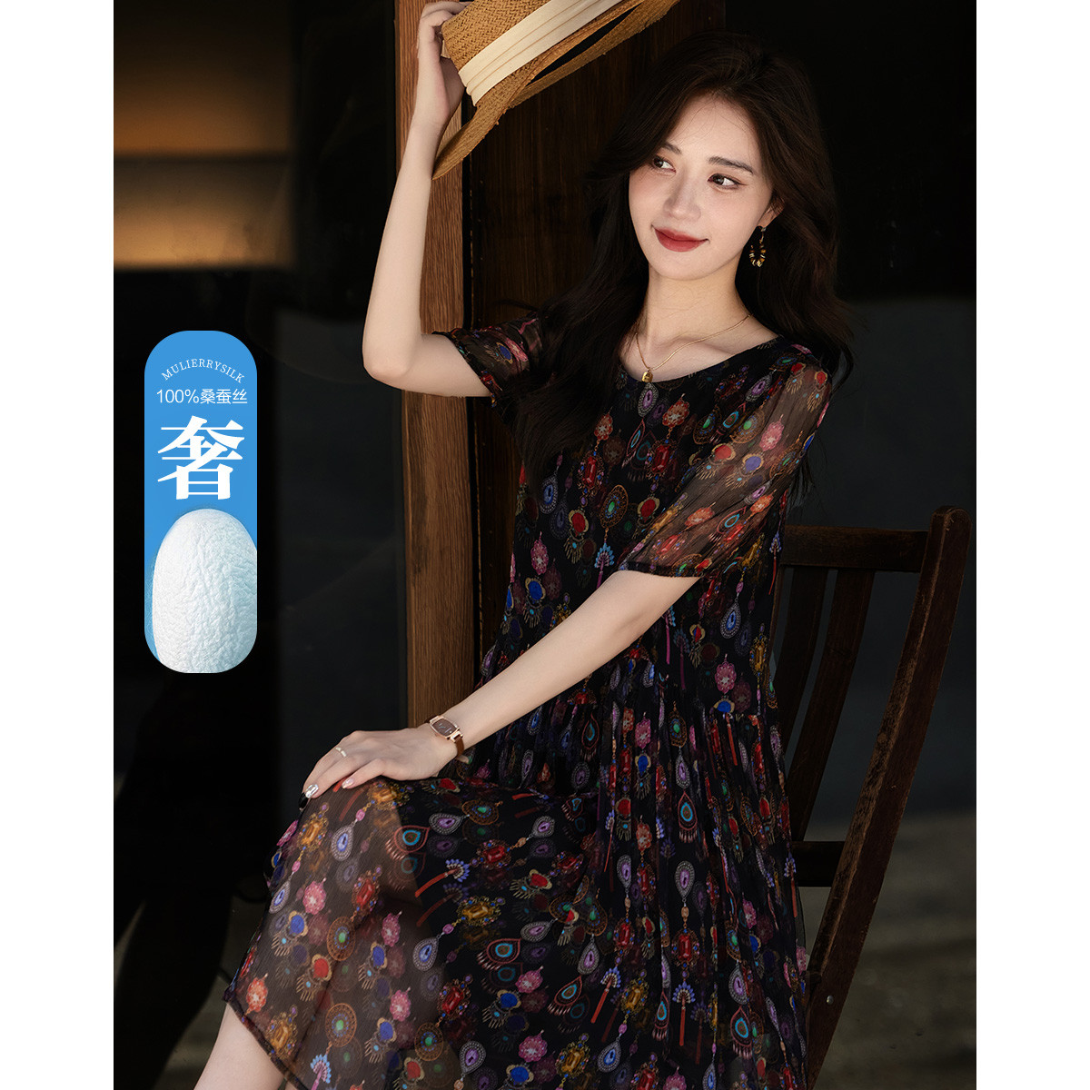 【民族风印花裙】夏轻奢优雅宽松大摆显瘦短袖桑蚕丝连衣裙 570177