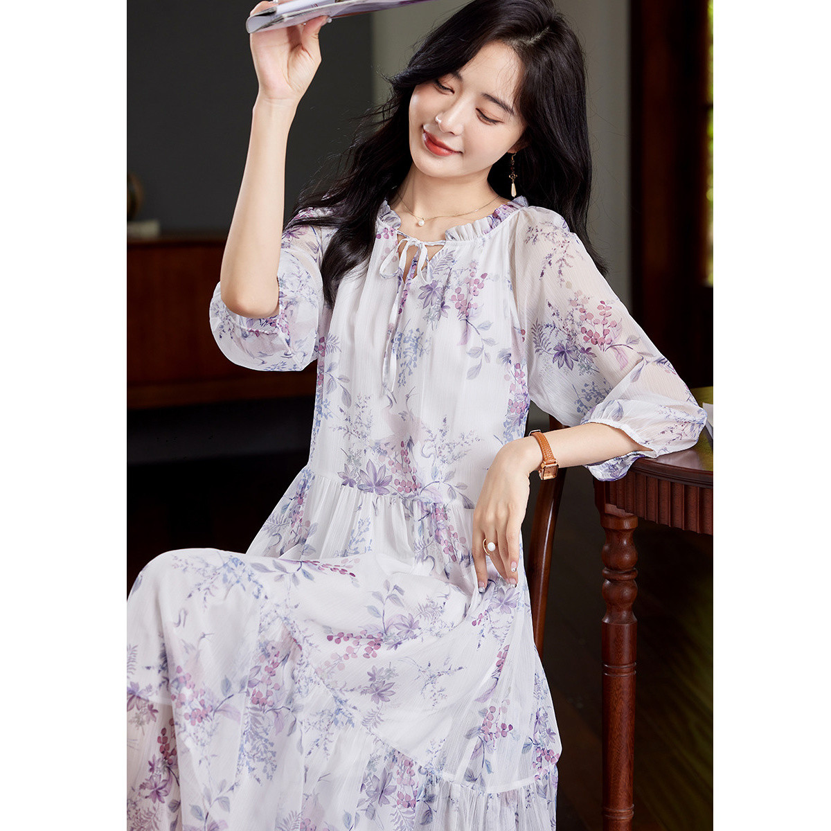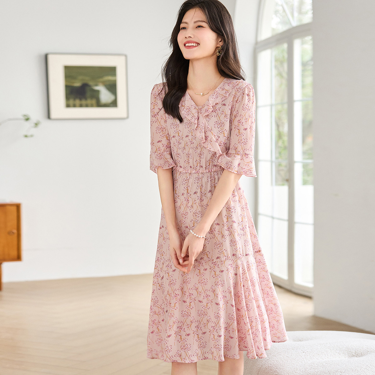 浪漫印花2025夏季女装时尚真丝荷叶领桑蚕丝显瘦连衣裙 987224