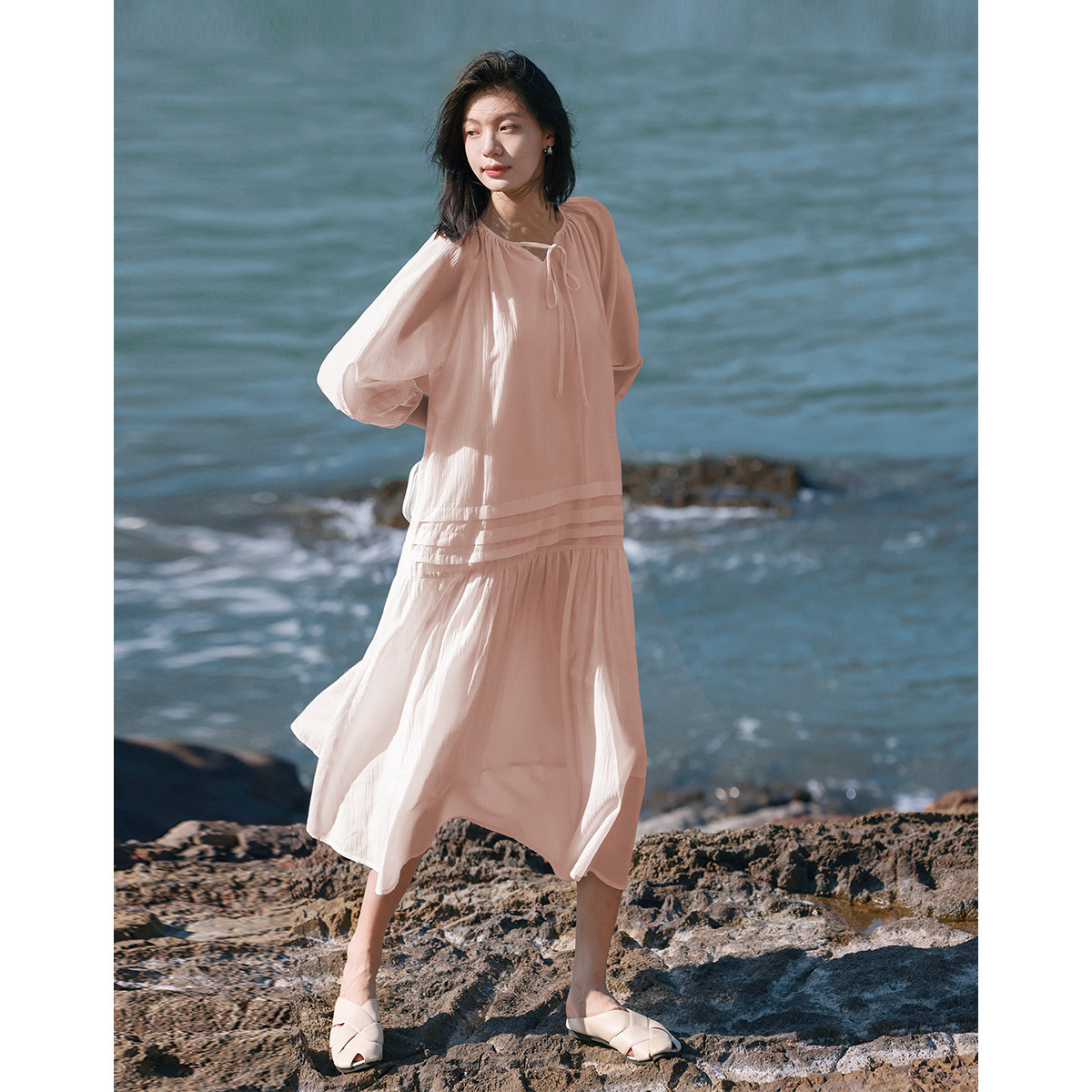 【优雅气质粉长裙】夏圆领领口系带中袖连衣裙 231042