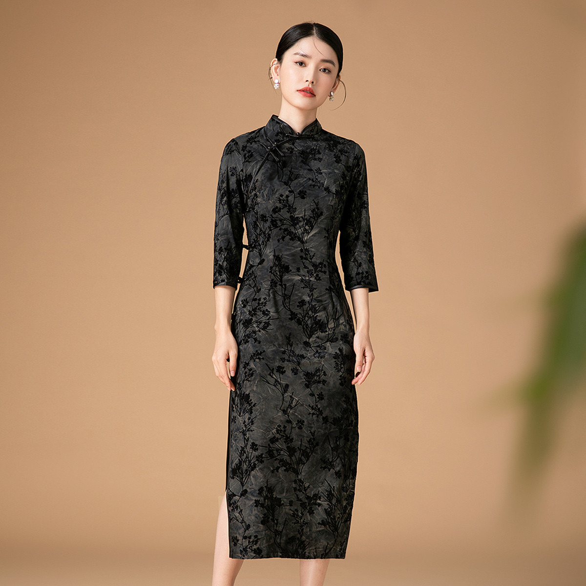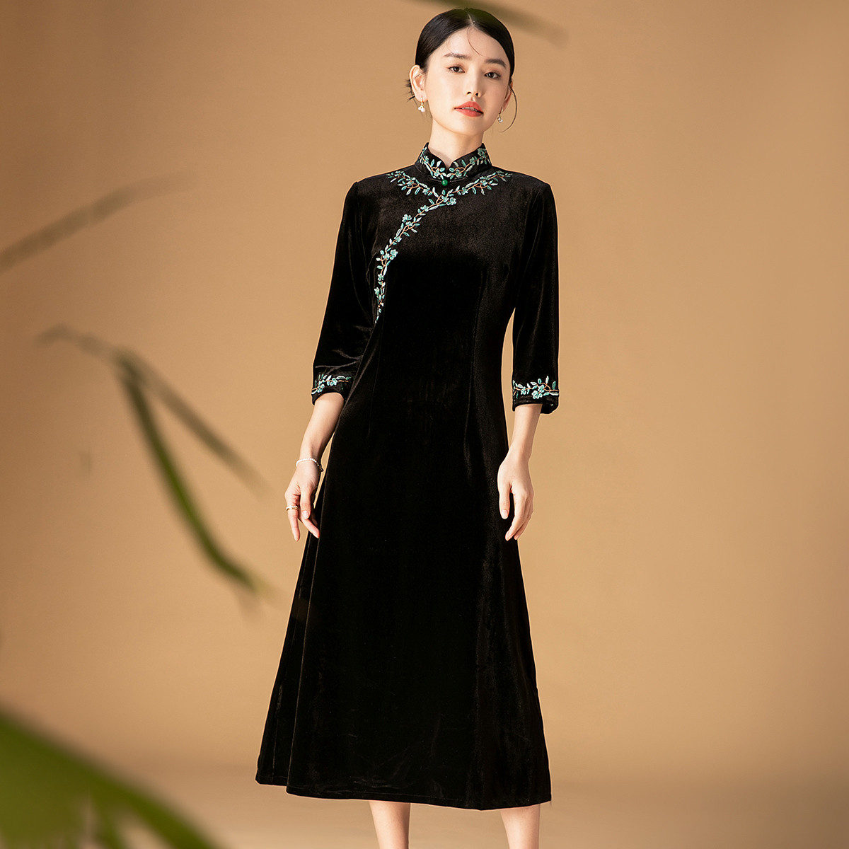 【新年红色国风改良旗袍】丝绒立领盘扣修身中长款连衣裙 565983