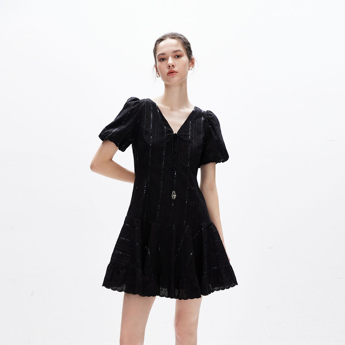 【田园风】夏季刺绣V领泡泡袖A字短裙连衣裙女 164058