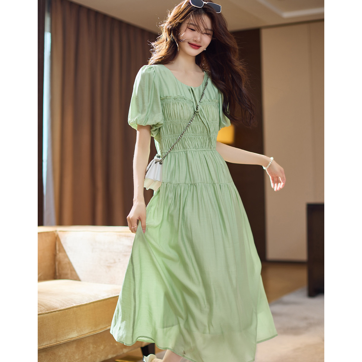 泡泡袖优雅气质温柔风高腰连衣裙女 265691