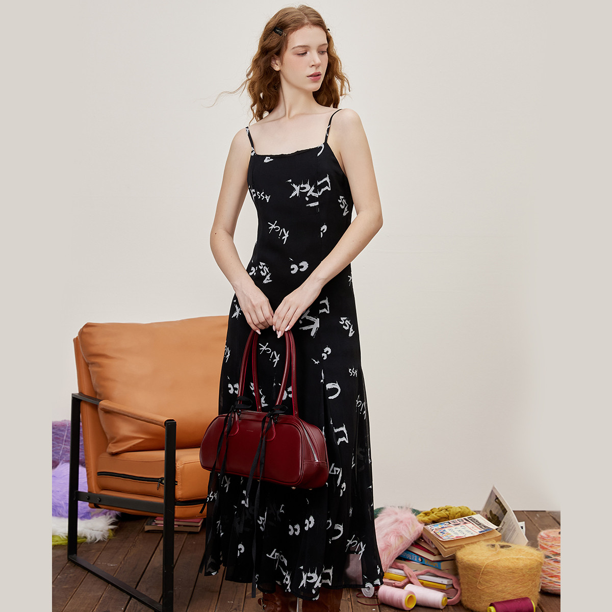 个性涂鸦印设计荷叶边开叉吊带裙夏季休闲度假风连衣裙 761757