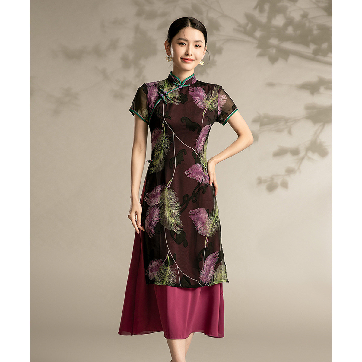 改良旗袍连衣裙夏季印花国风中长飘逸连衣裙 049503