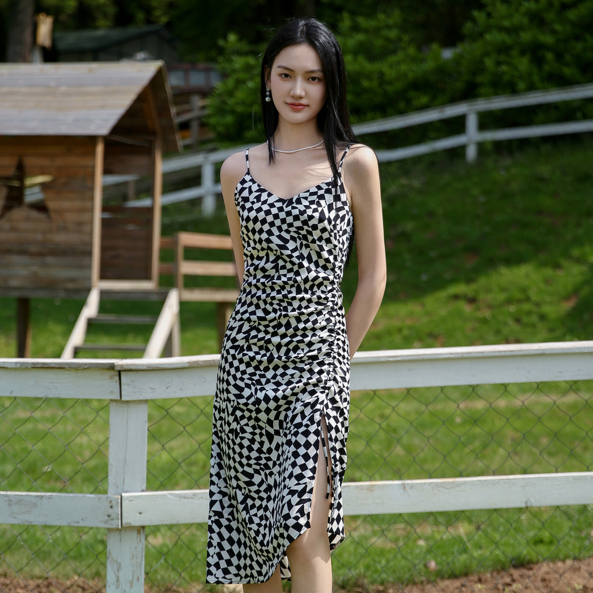 潮流黑白格纹连衣裙女夏季独特收褶设计感裙子时尚开叉吊带裙女 161091