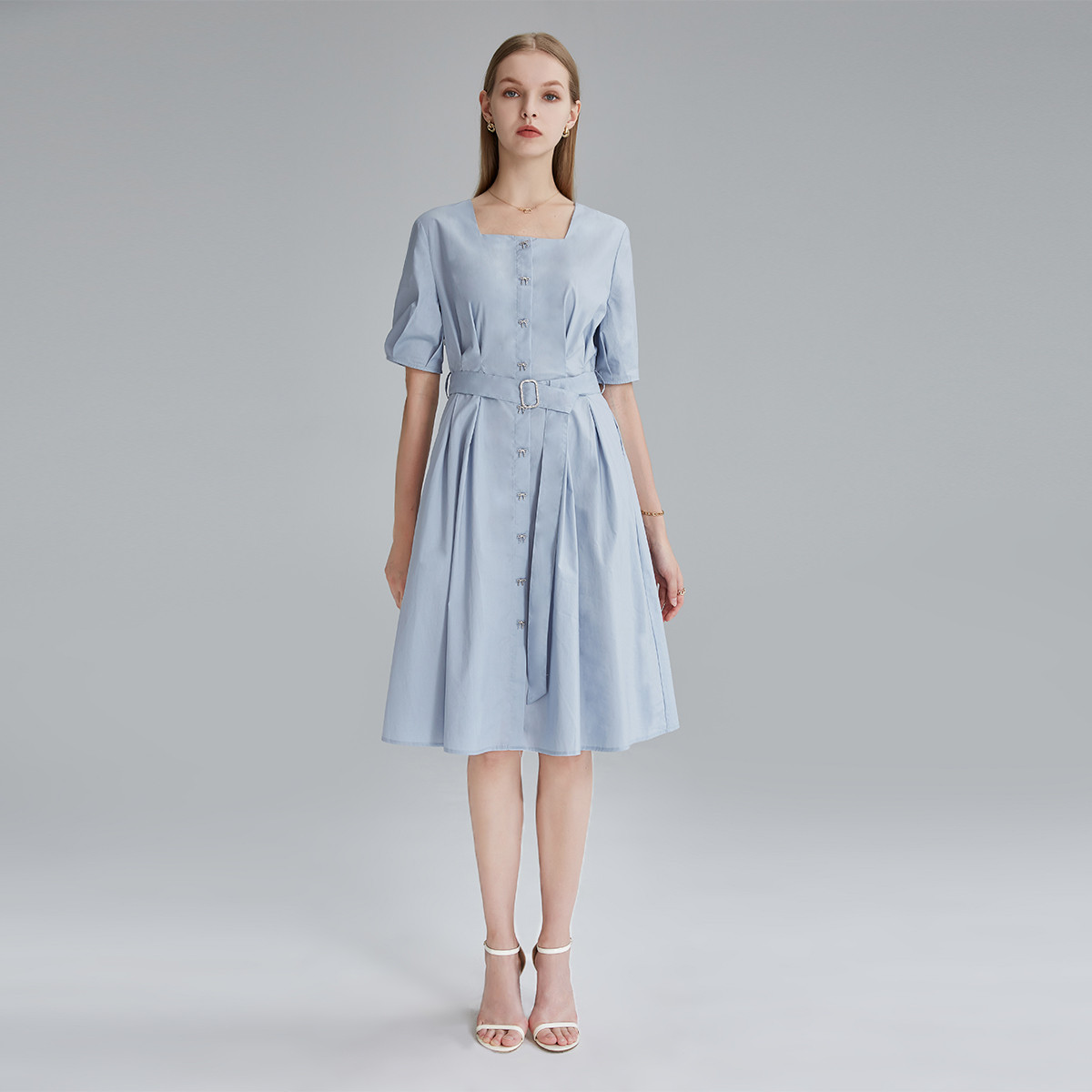 【纯棉】夏季新款蝴蝶结纽扣女都市优雅方领系带中长款休闲连衣裙 943007