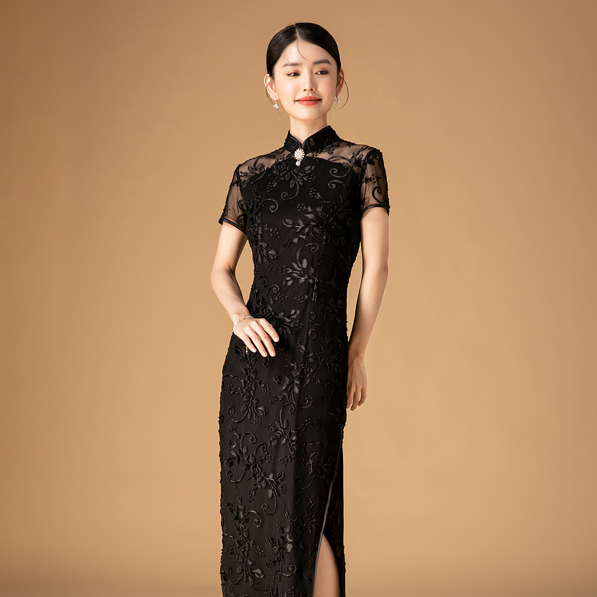 中长款双层花绒中国风轻奢短袖时尚改良旗袍连衣裙 280863