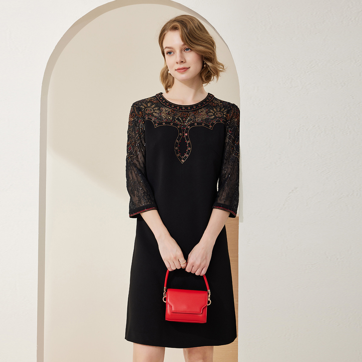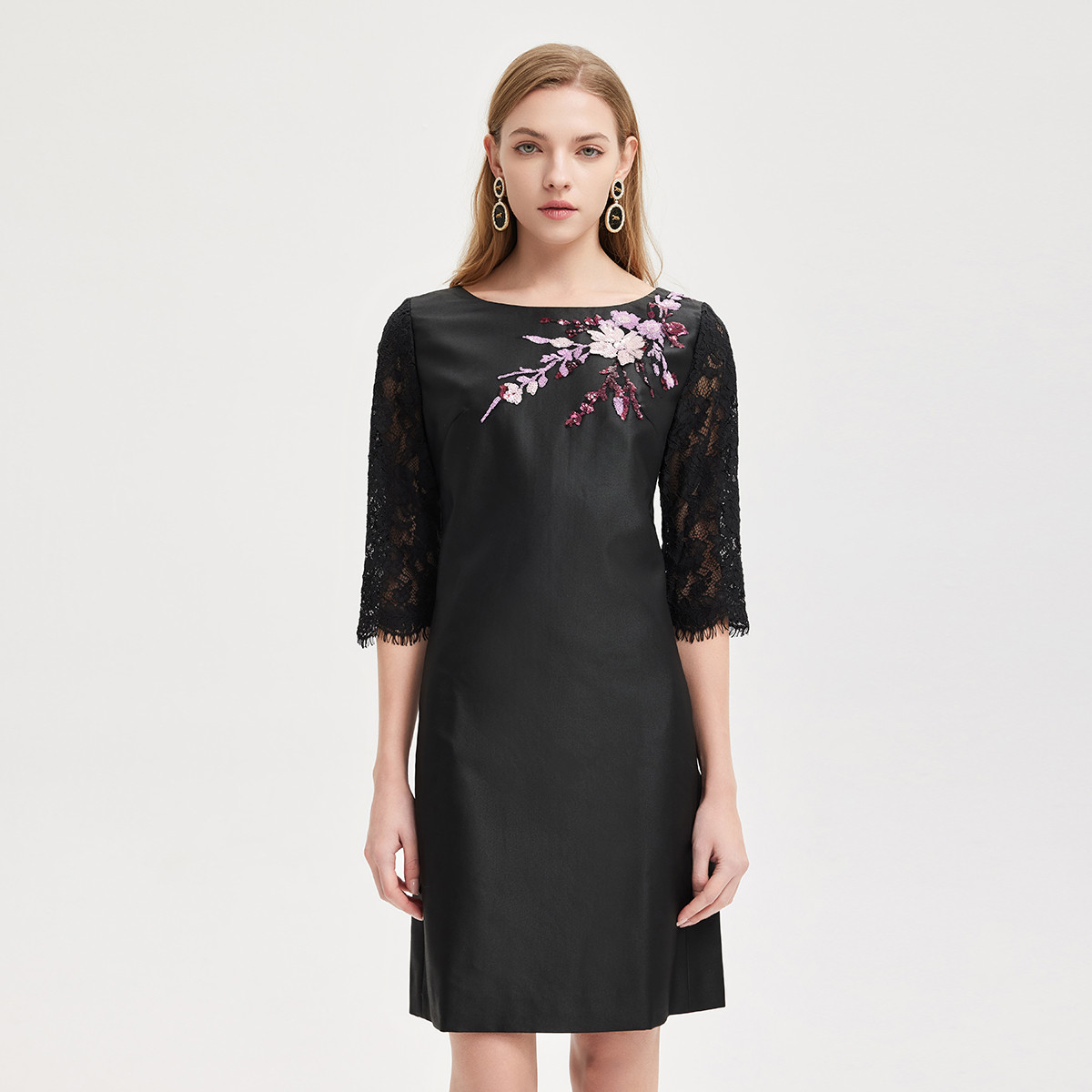 春季简约直身立体贴花蕾丝七分袖端庄气质A摆连衣裙 937183