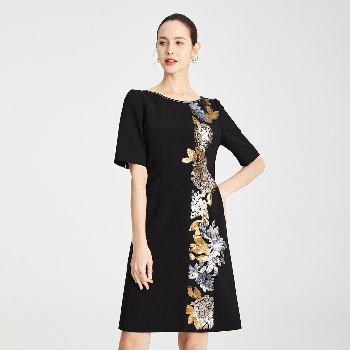 春季华丽烫图修身显瘦小黑裙圆领七分袖连衣裙 109535