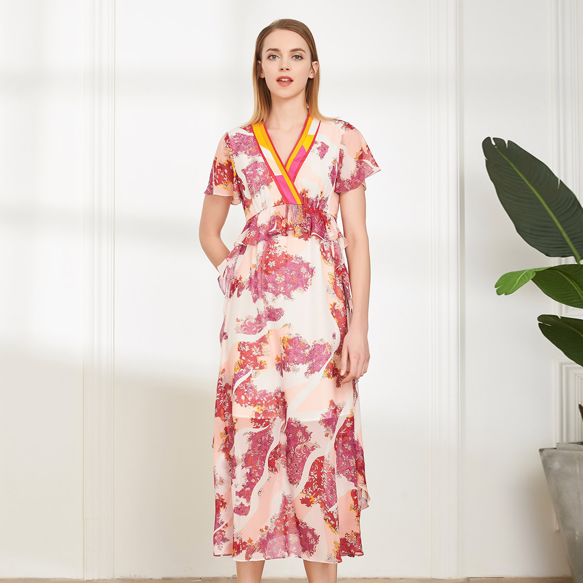 夏装v领褶皱荷叶边连衣裙女假两件气质显瘦短裙 979220