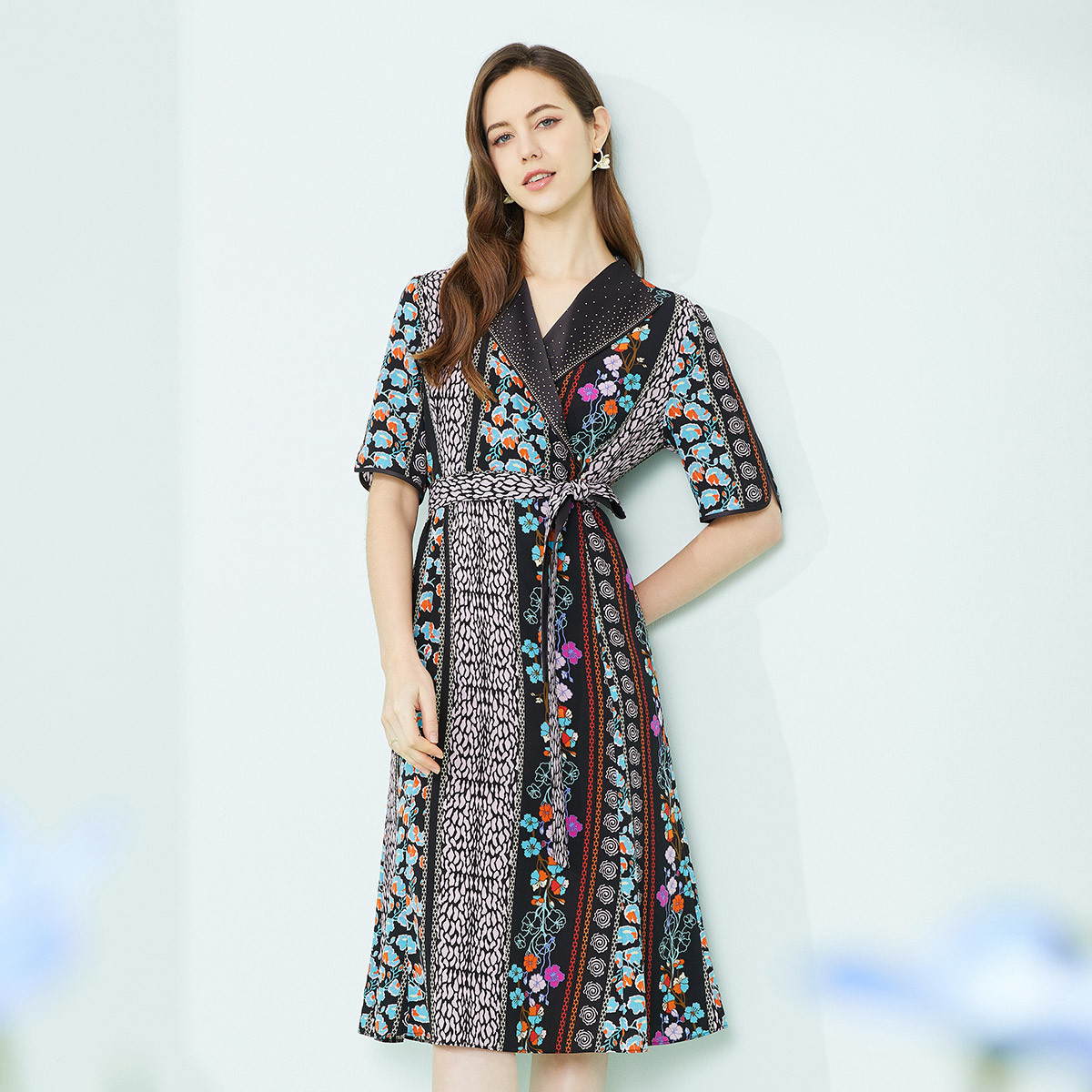 商场同款秋季复古异域波西米亚风情印花别致翻领5分袖连衣裙 443487