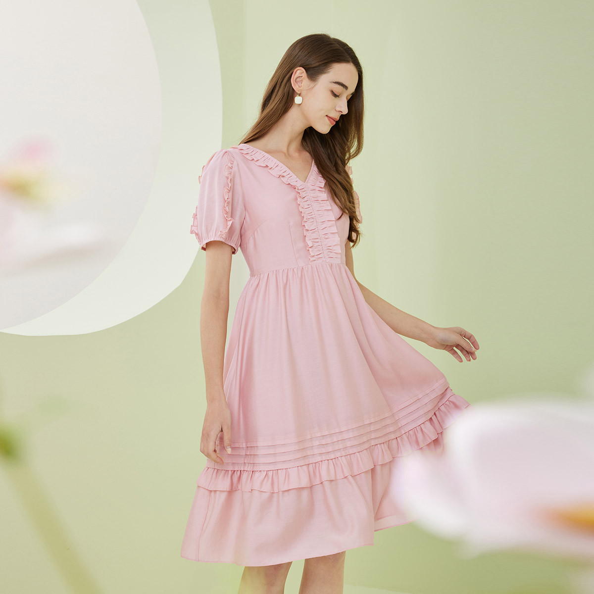 夏装v领褶皱荷叶边连衣裙女假两件气质显瘦短裙 979220