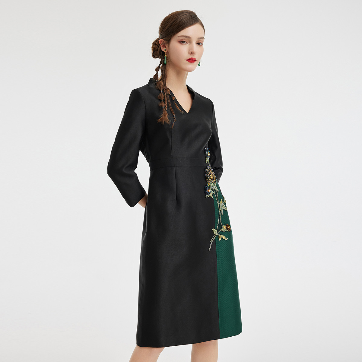 春季V领撞色拼接手工钉珠优雅气质收腰显瘦连衣裙 914463