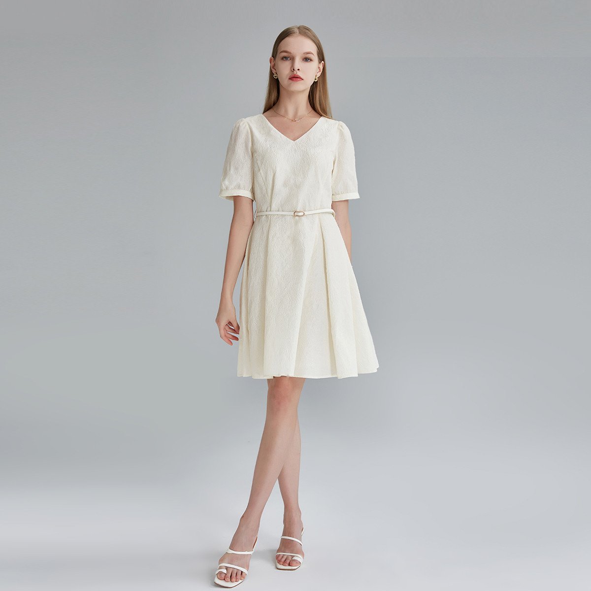 夏季新款肌理V领系带露背设计女式优雅温柔甜美休闲中长款连衣裙 075679