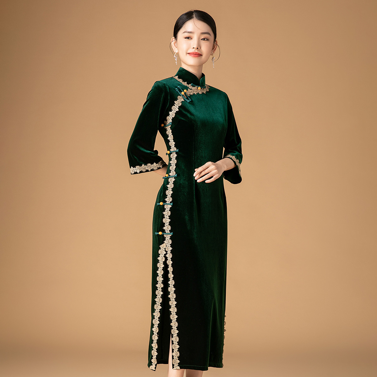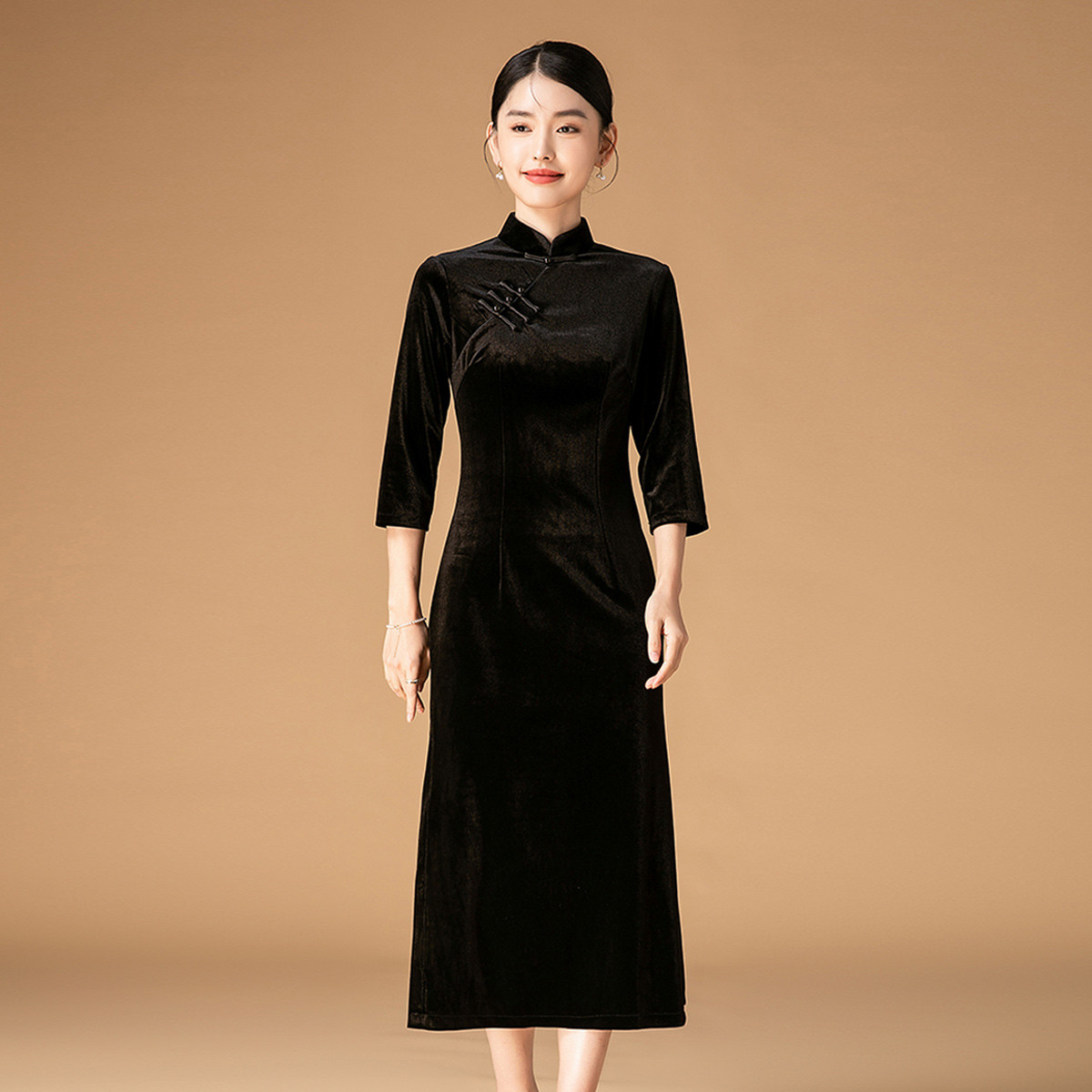 时尚复古改良旗袍春秋连衣裙国风立领盘扣丝绒开叉旗袍 489503