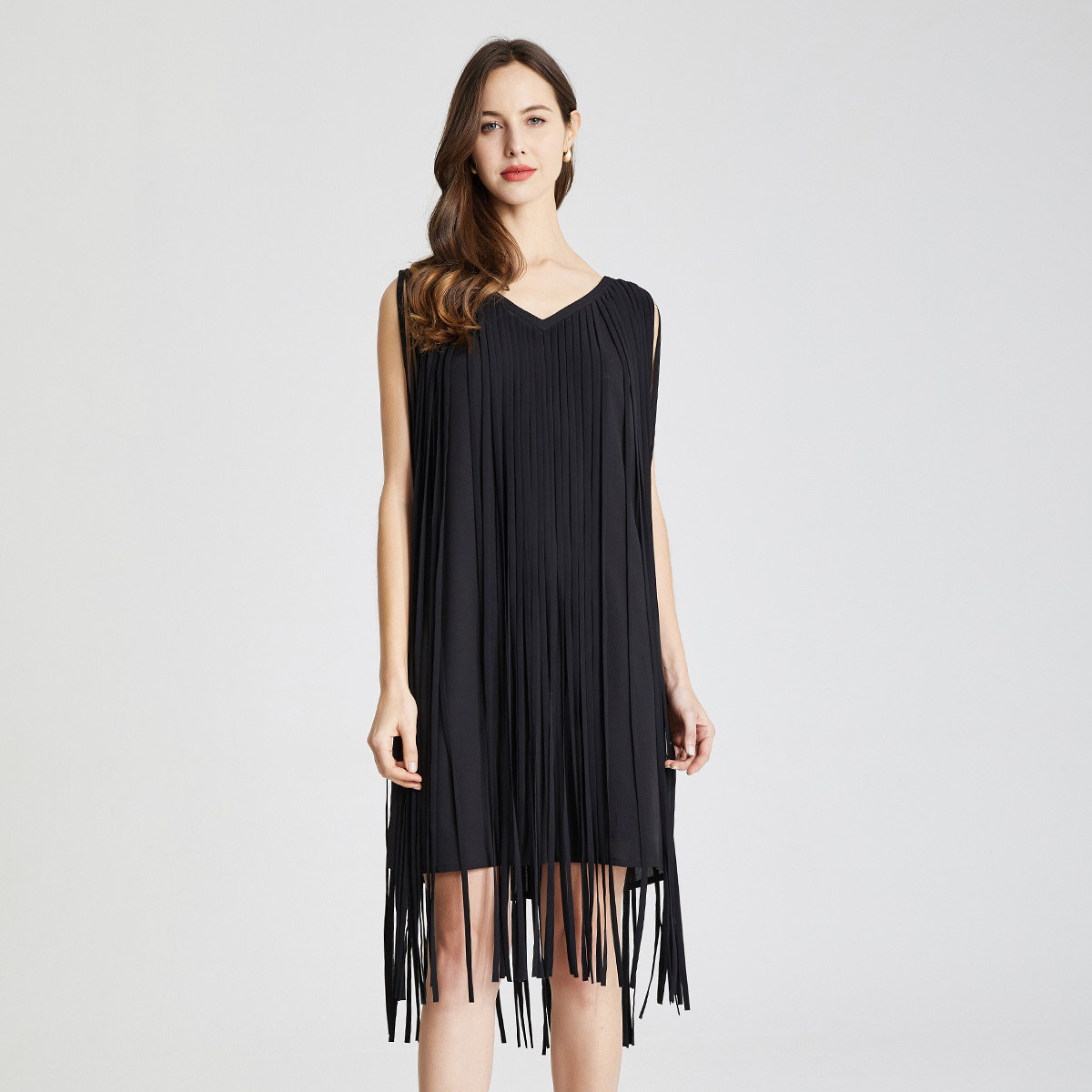 春夏摩登流苏V领无袖中长款连衣裙女 487263