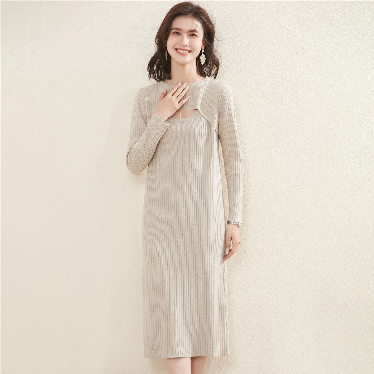 【配大衣】圆领中长款针织连衣裙女秋冬质感气质长裙打底裙子 522143