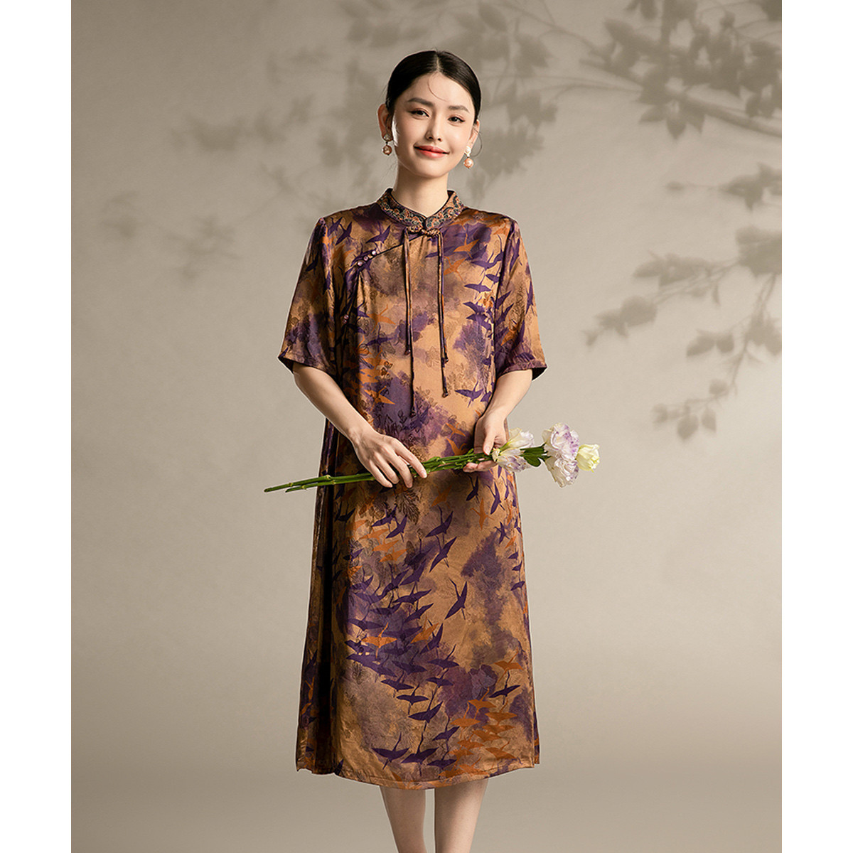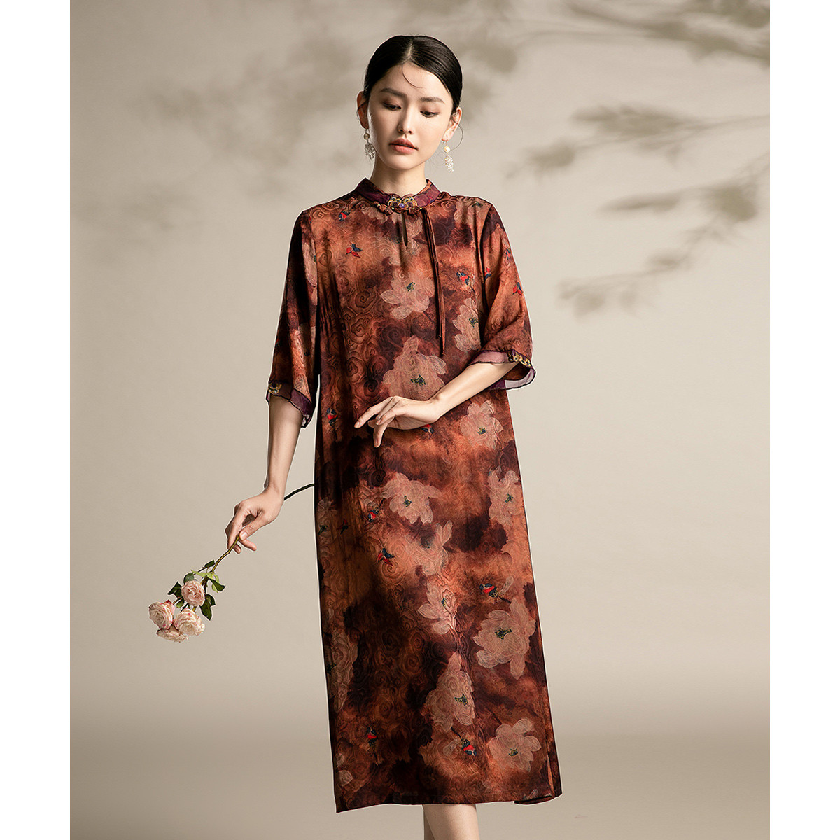 夏季五分袖改良连衣裙中老年国风印花宽松中长裙子女 128159