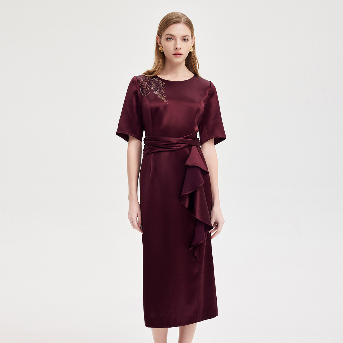 中袖收腰直身腰间立体收褶挡肉显瘦华丽高贵礼服连衣裙 496735