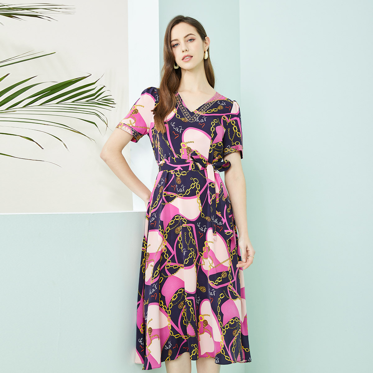 商场同款秋季名媛风优雅印花链条撞色v领烫钻收腰式连衣裙 156703
