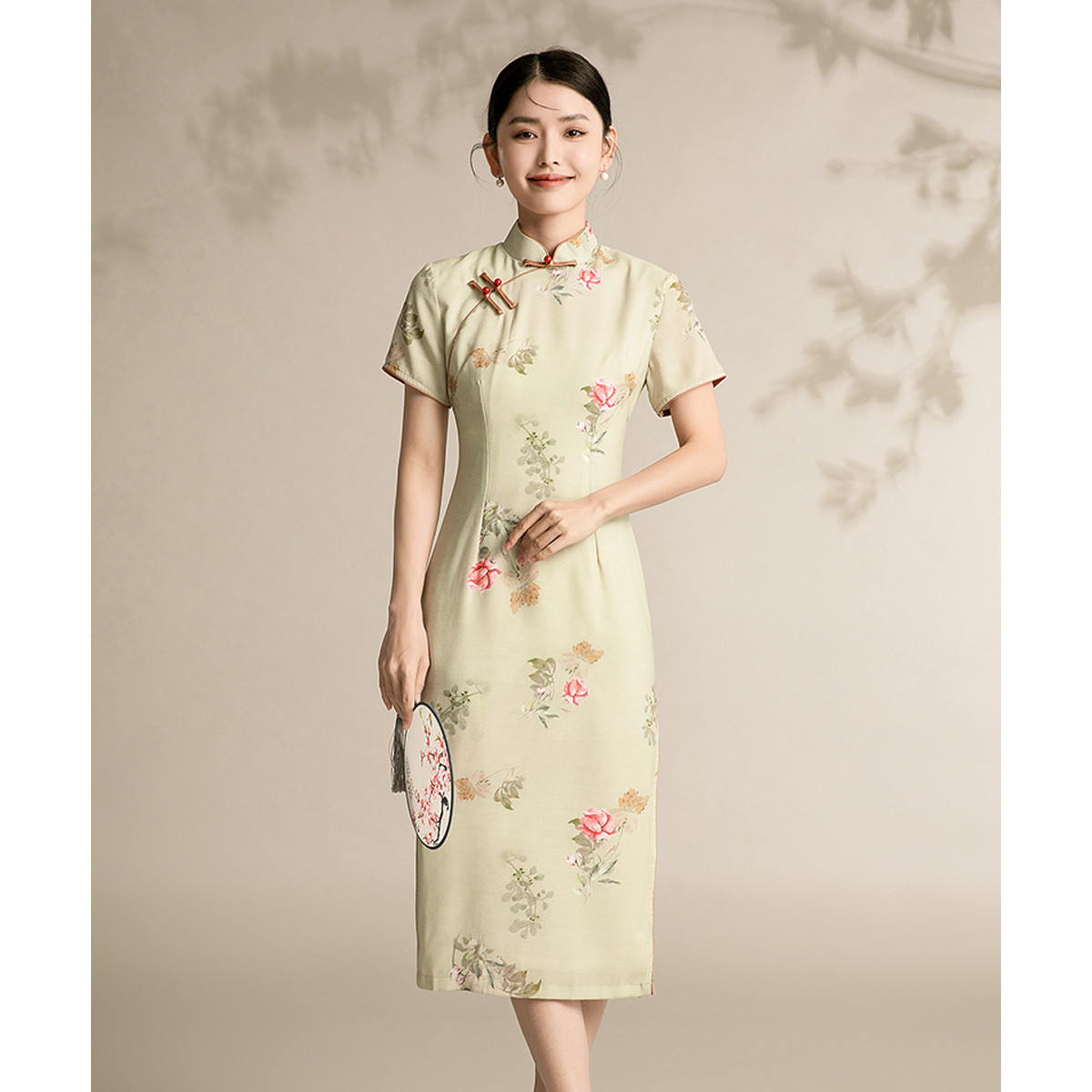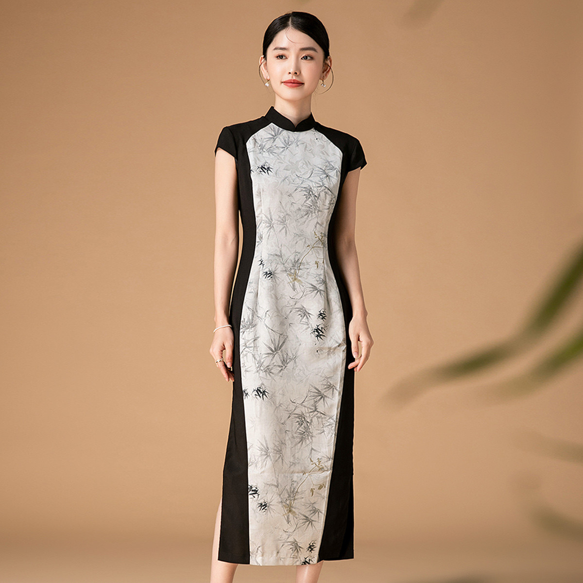 新中式印花旗袍连衣裙短袖中长款改良开叉旗袍裙 111519