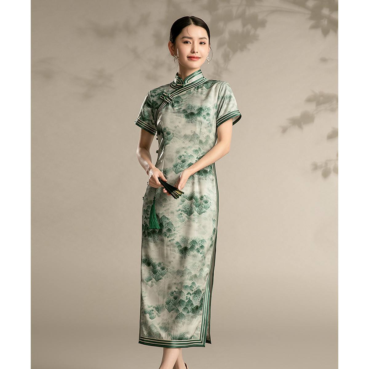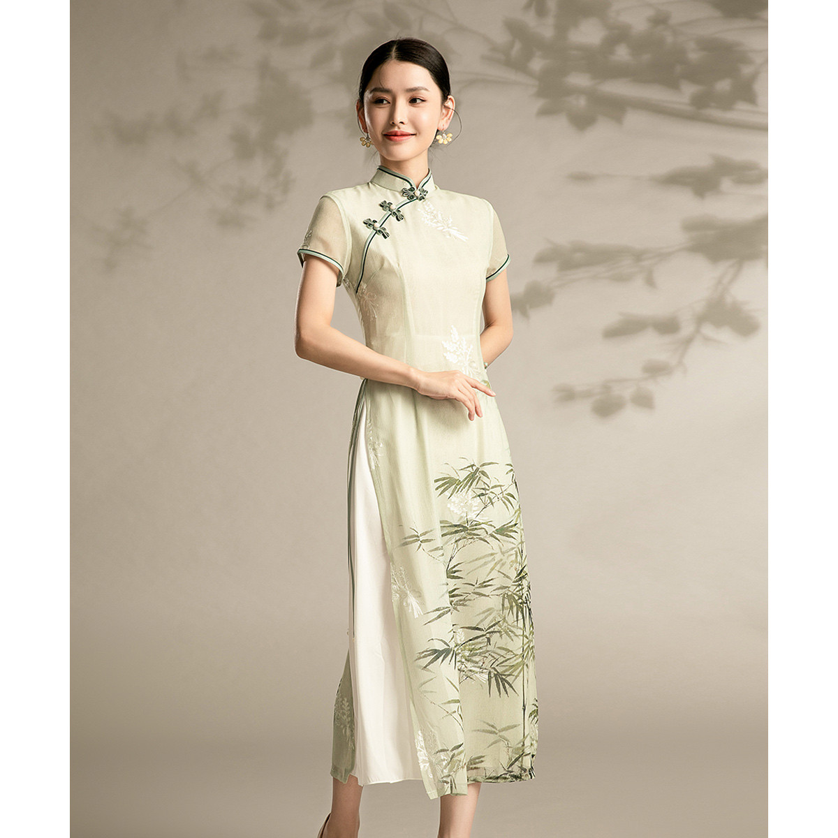 新中式中长款旗袍短袖连衣裙浅色晕染旗袍 020639