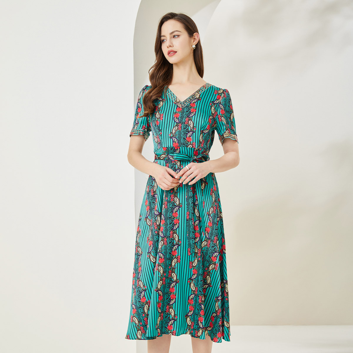 商场同款秋季烂漫波西米亚印花撞色小v领烫钻短袖长款连衣裙 380255