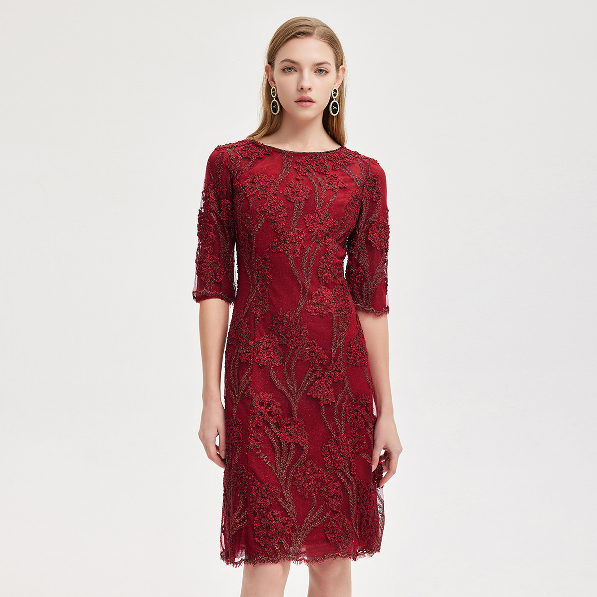 春夏圆领中袖立体绣花优雅气质宴会场合礼服连衣裙 076447