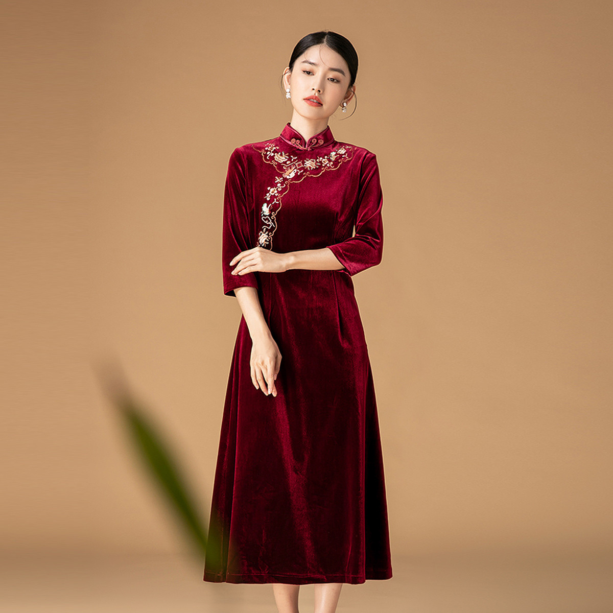 金丝绒中式旗袍改良国风婚宴喜庆过年礼服刺绣连衣裙 182559