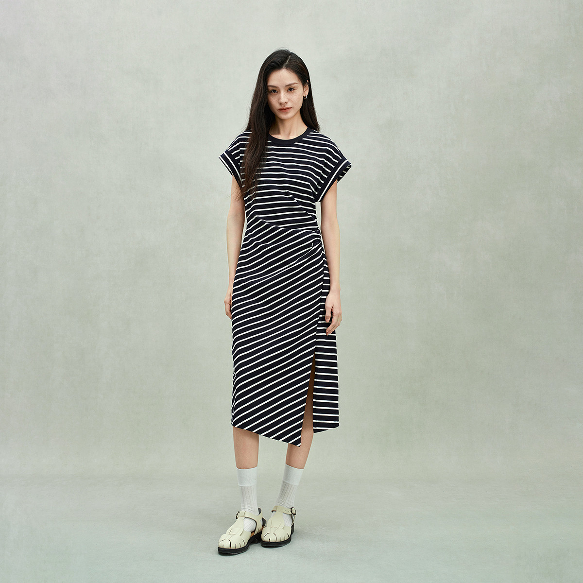限定系列OCH.春装 收褶开衩休闲纯棉条纹不规则连衣裙 998415
