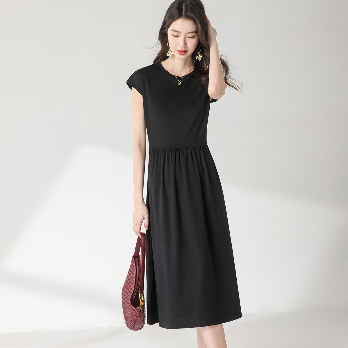 含桑蚕丝~赫本风小黑裙圆领无袖纯色连衣裙简约气质直筒显瘦裙子 548307