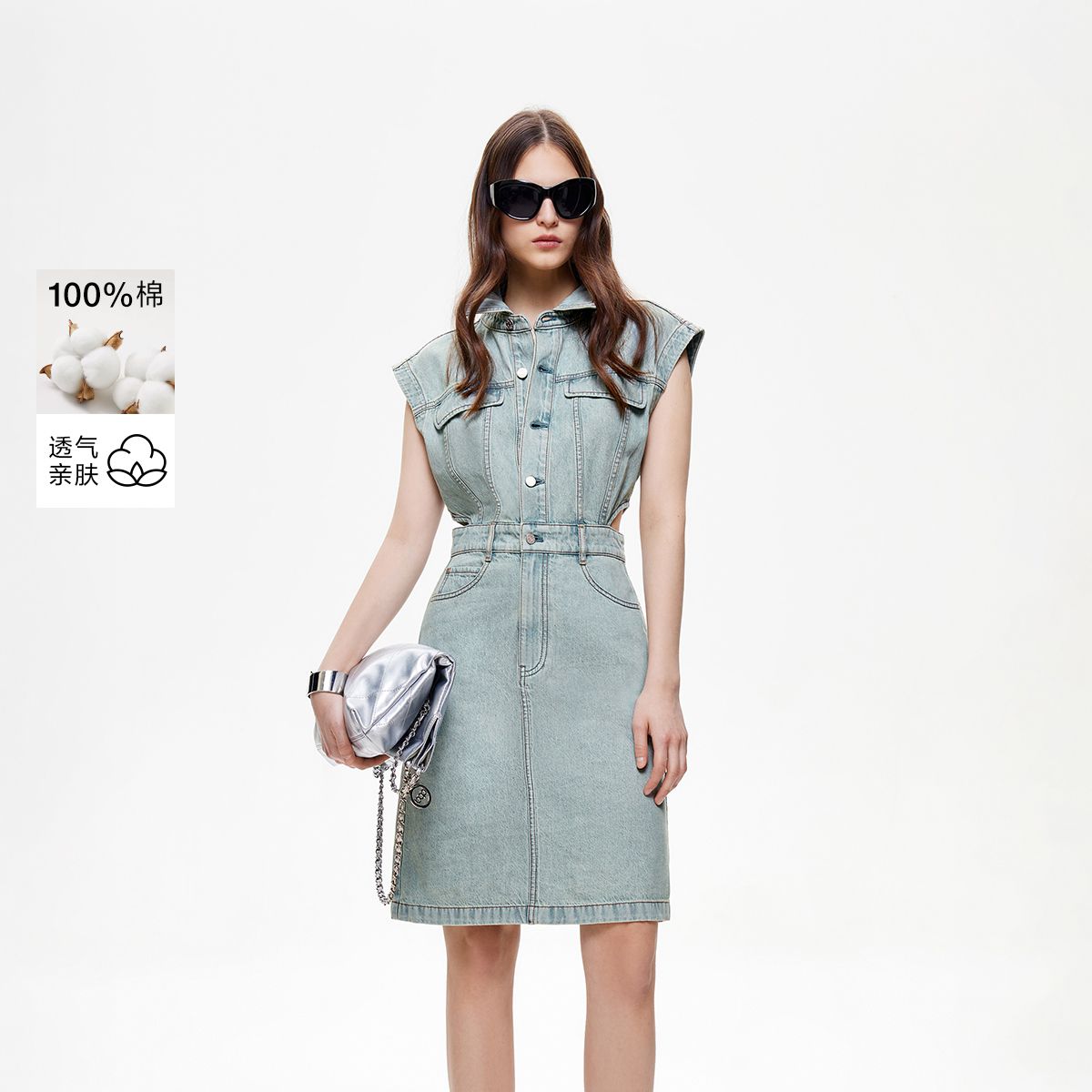 【侧腰镂空】2025夏季单排扣口袋收腰翻领短裙牛仔连衣裙女 922074