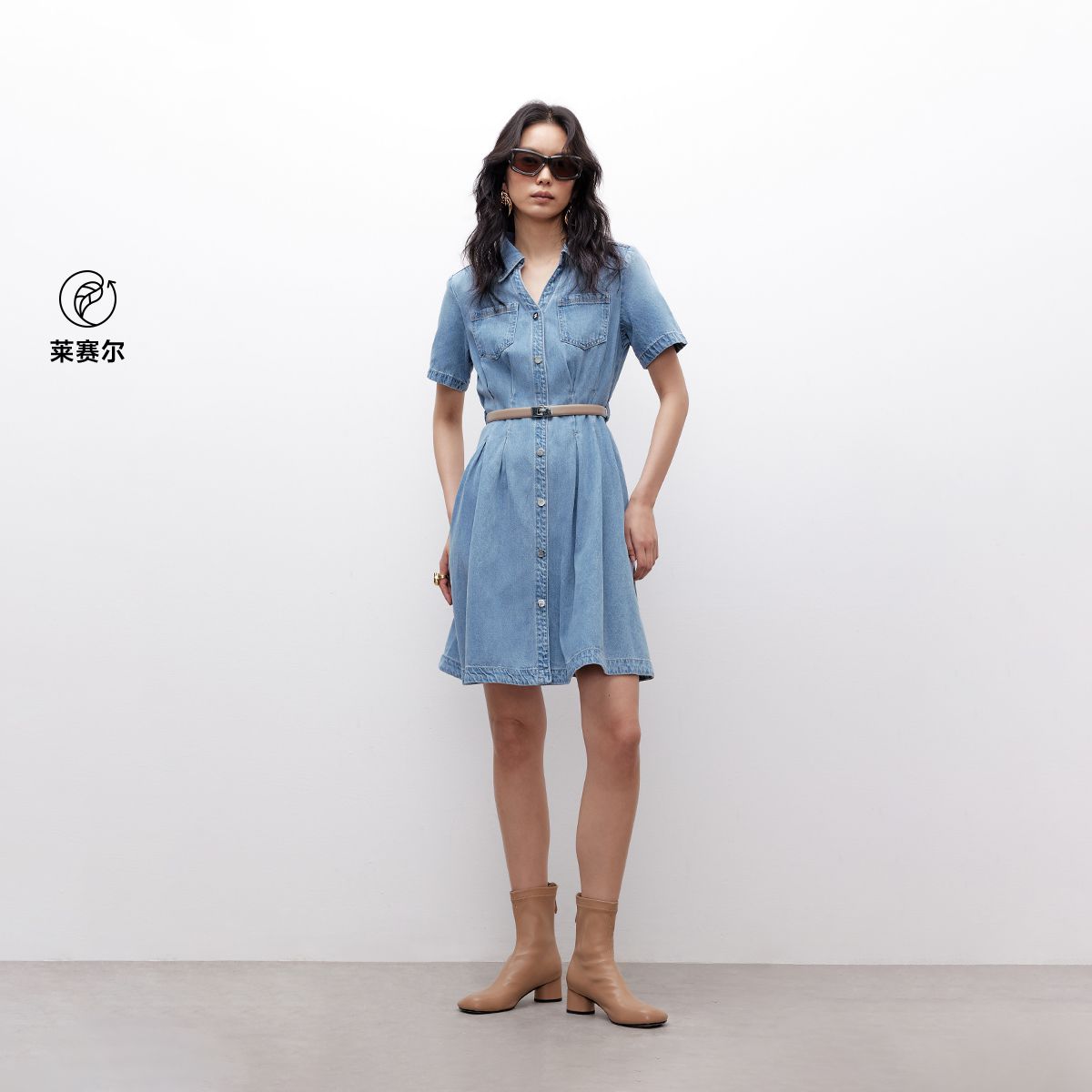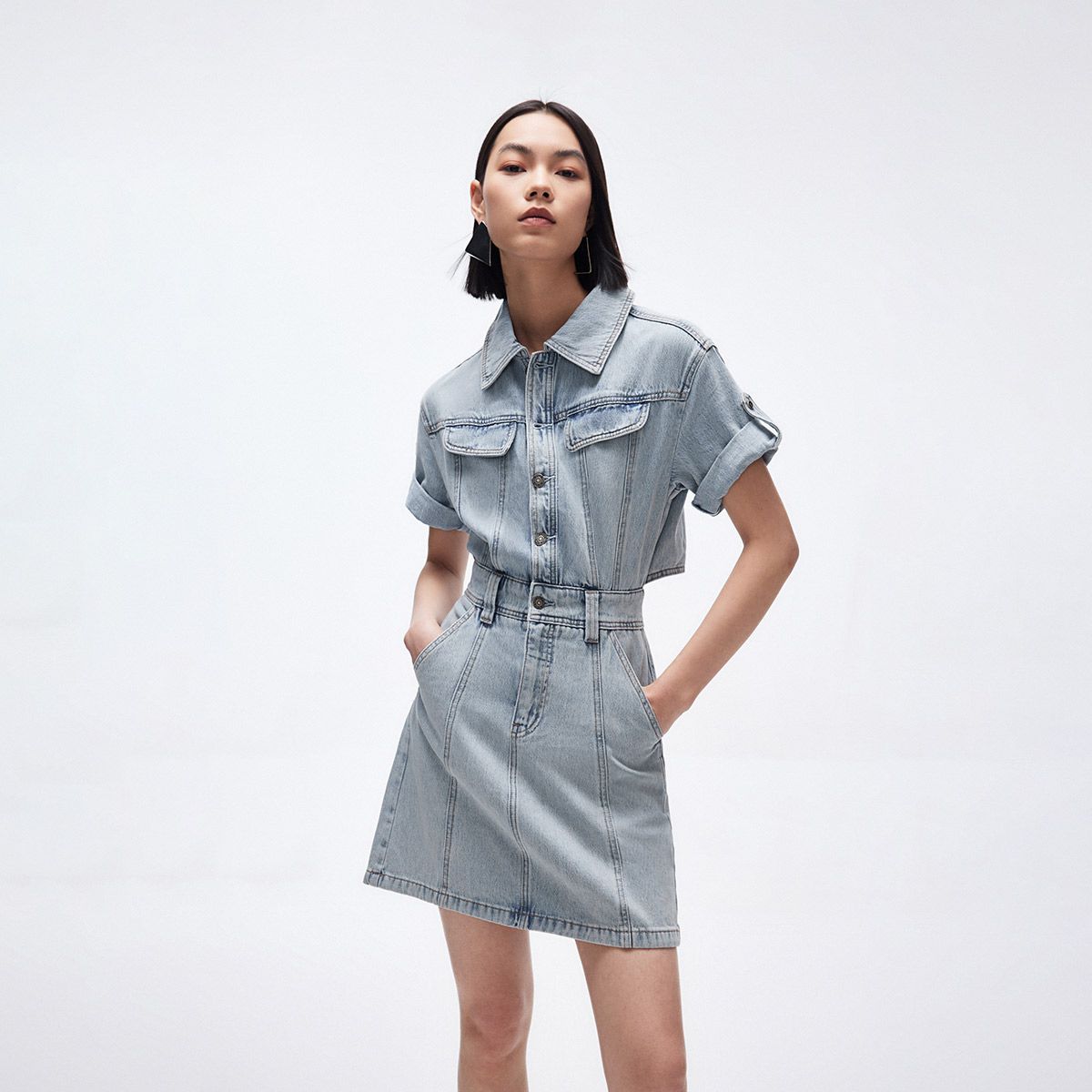 【可拆卸腰带】2025春季简约舒适V领牛仔短裙衬衫连衣裙女 284314